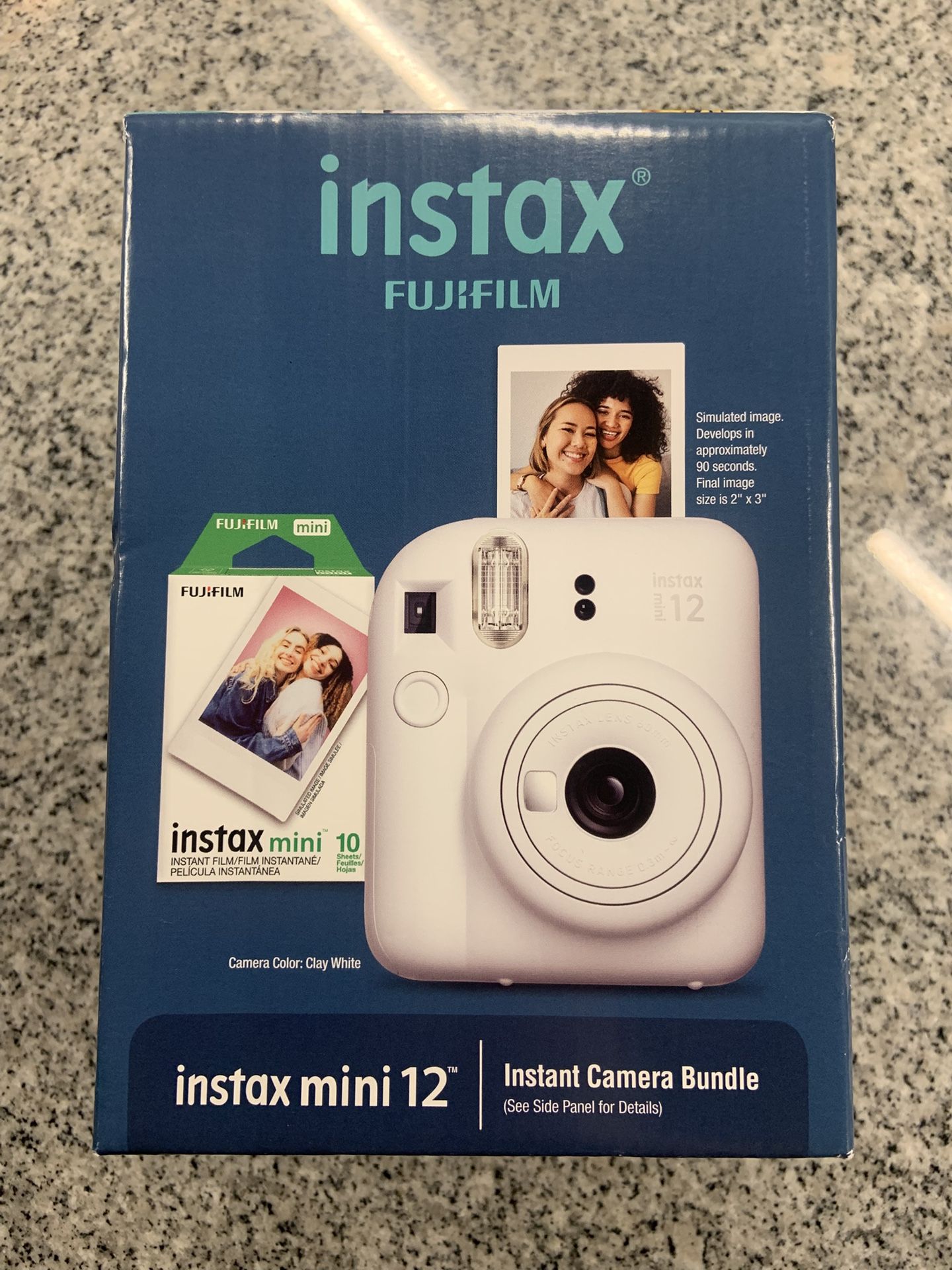 instax mini 12 FUJIFILM INSTANT CAMERA Brand New! In box never opened (was a Christmas gift I want to exchange) Original price $94 Selling for $75 Develops in approximately 90 seconds. Final image size is 2" x 3" INSTAX MINI 12 Instant Camera Key Features: • Automatic Exposure: The high-performance flash automatically calculates surrounding brightness and adjusts shutter speed accordingly - no need for any special settings. • Automatic Flash Control: The INSTAX MINI 12 instant camera reduces any blown out highlights from the flash when using Close-Up Mode. • Selfies & Close-Ups Never Looked Better! - Simply twist the lens to instantly switch to Close-Up Mode! When you see the "CLOSE-UP" mark, it's on Close-Up Mode! - You can check your framing with the mirror next to the lens. Instant Camera Bundle Includes: - 1 INSTAX MINI 12 Instant Camera (Clay White) - 1 INSTAX MINI Instant Film Pack (10 Sheets) - 1 INSTAX DIY Idea Booklet (Not Shown), outlining creative projects you can create with INSTAX Instant Film. - Hand Strap - 2 AA Batteries - INSTAX MINI 12 Manual - 1-Year Limited Warranty for Camera - 90-Day Limited Warranty for Film