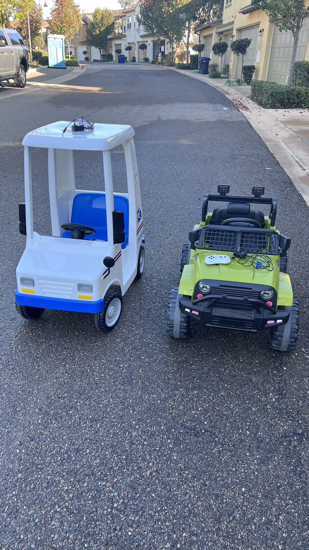 Selling 2 electric cars for kids 3-5 years old. 1 - mail truck. 6 months old. Works great. No issues. 2 - jeep. Over 3 years old. Goes with remote control. Jeep’s battery is dead. Need replacement. Both cars have chargers. Price for both.