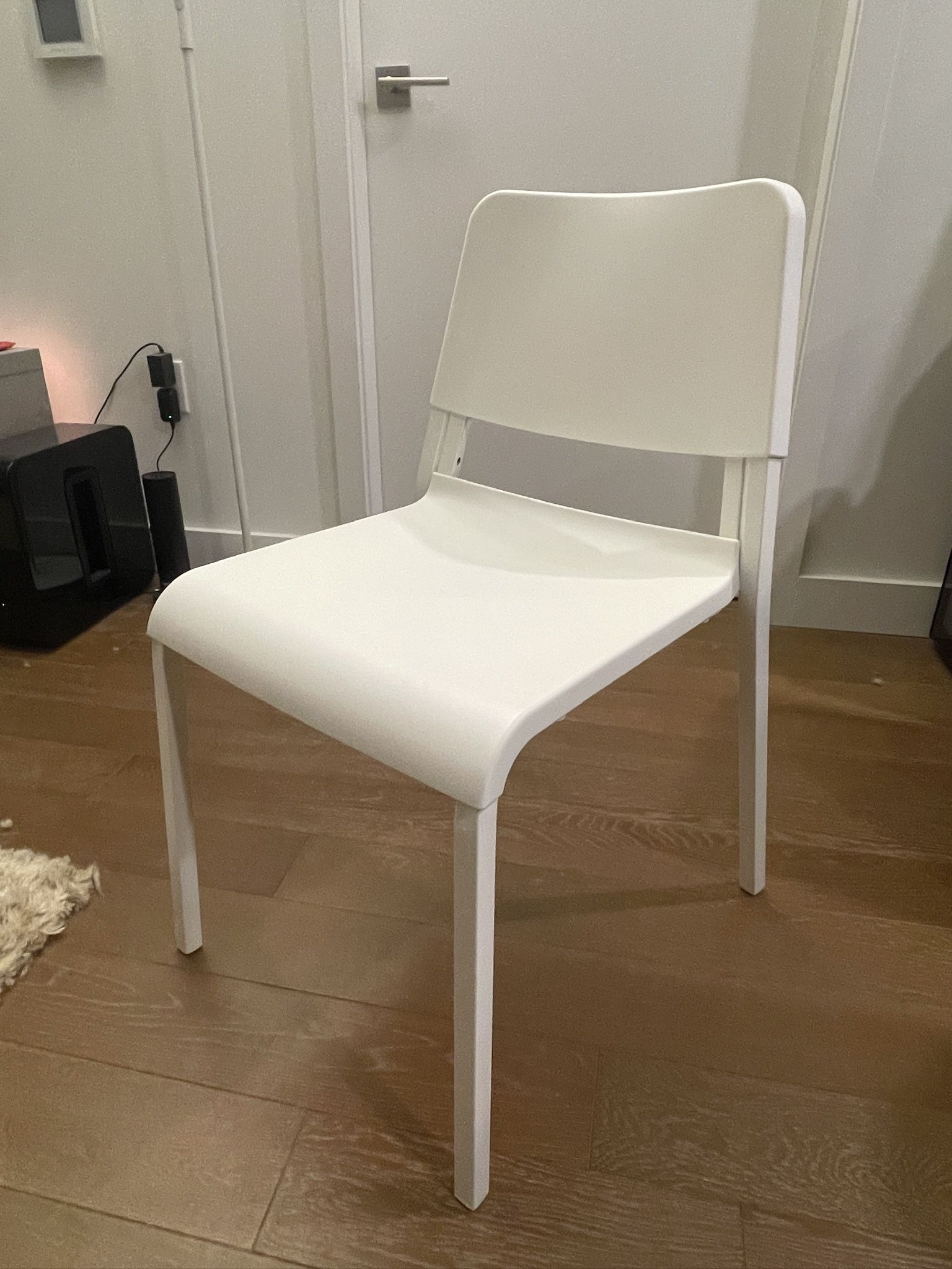 A set of 6 dinner chairs and seat cushions in very good condition. - Vertically stackable - Originally $420+tax for the whole set We loved them actually. Sturdy and easy to store but we are switching to a new decor style so letting them go.