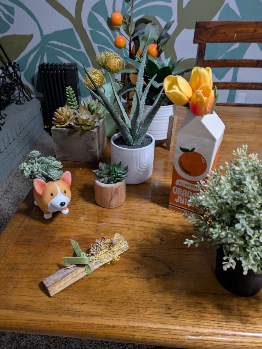 Fake flowers, plants, succulents, vases, planters, and decor. All pictured. They are from various stores: target, world market, IKEA, anthropology, the stein is handmade.