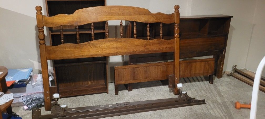 This Queen headboard is solid oak in great condition for the age. It includes bolt on rails with heavy-duty casters. Text Kyle for more info 253-720-zero-zero-74