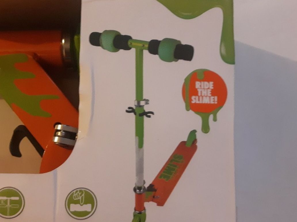 Nickelodeon Slime Two - Wheel Folding Kick Scooter With Slime Squishy Grips!. For ages 5+. Max weight 150LB. Condition is "New". Thr package is a little damage but the item is "New".