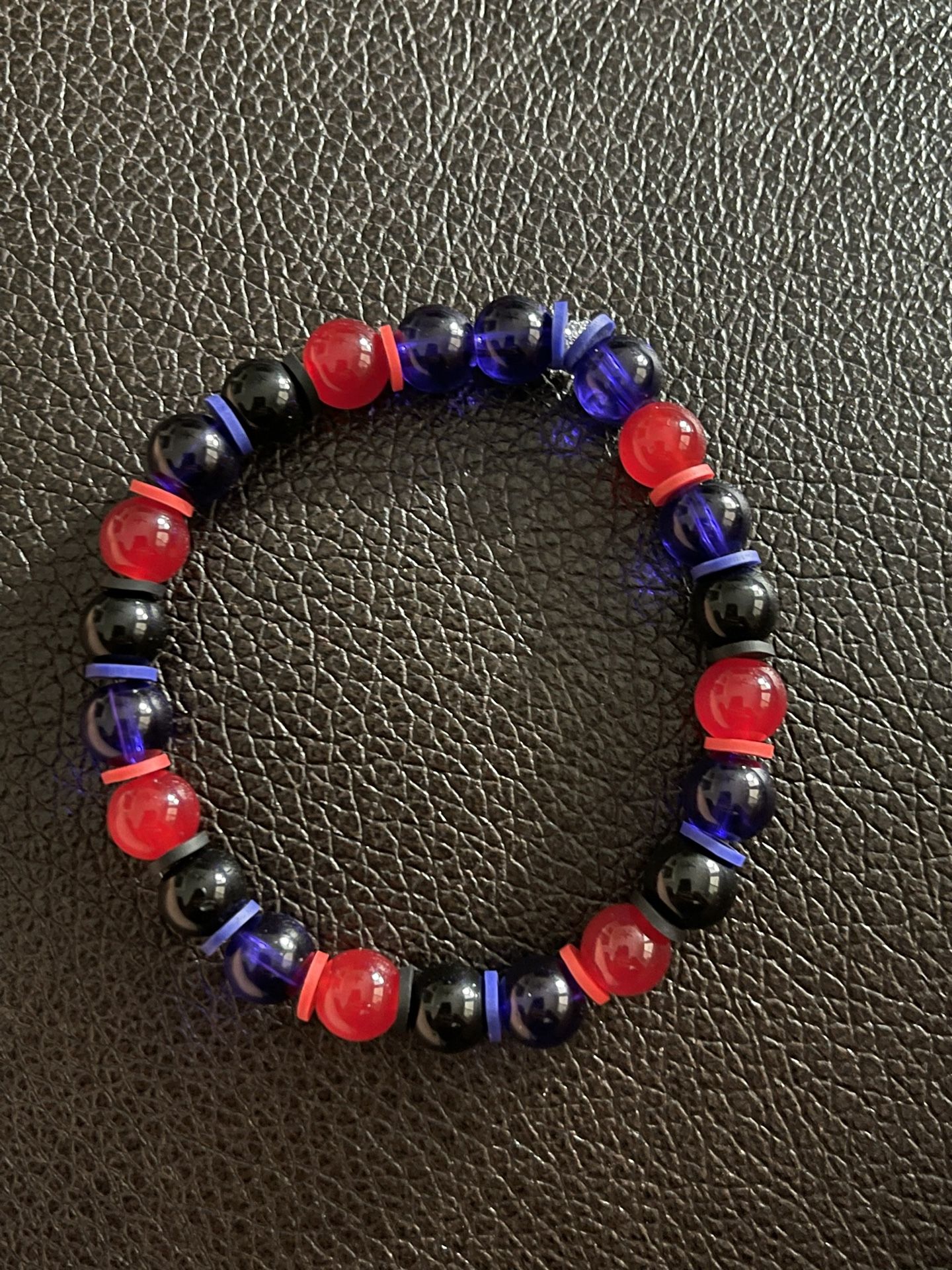 Homemade red blue and black bracelet