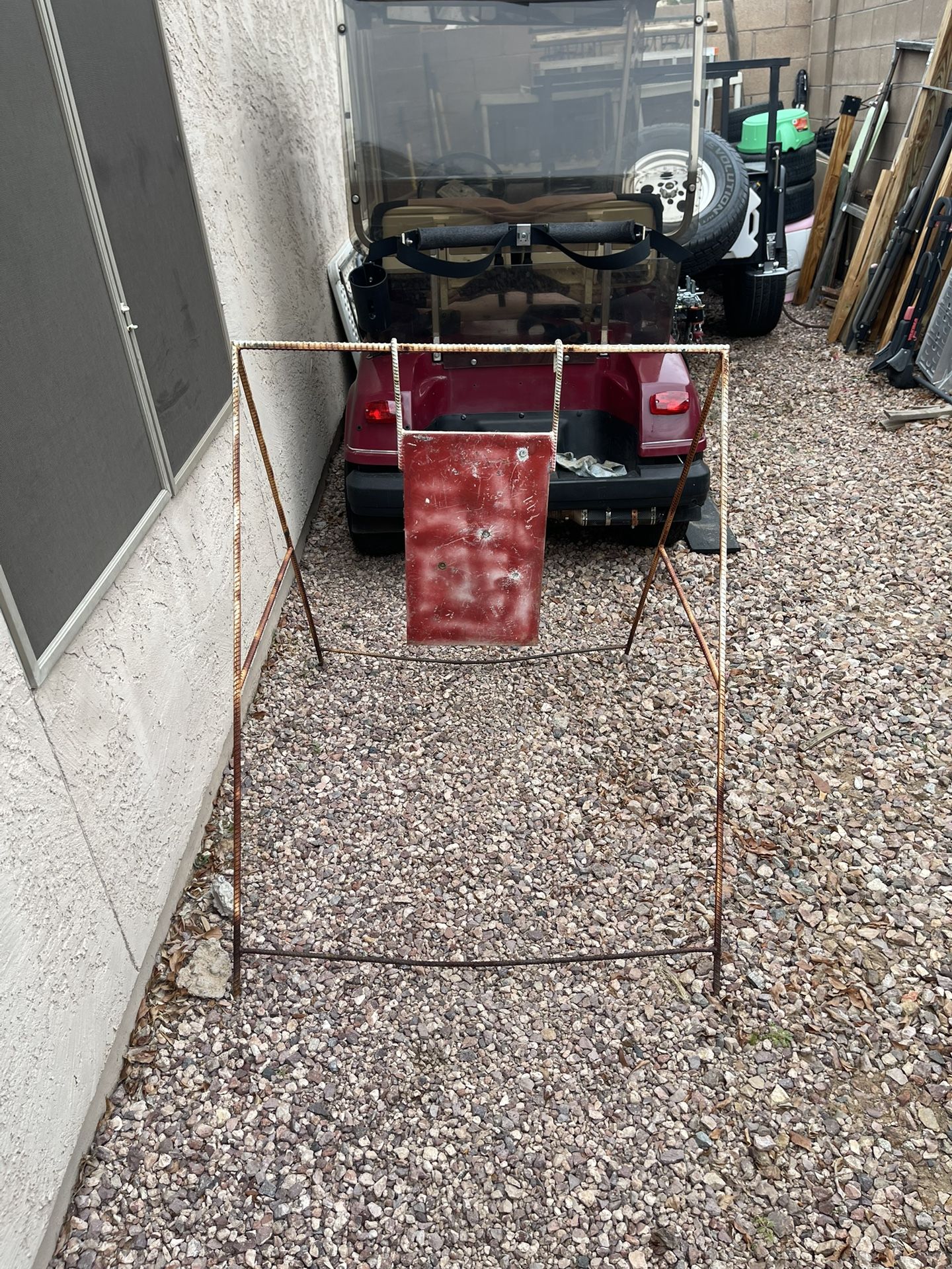 mild steel i set up at 800 yards 2 wood stand with bases u have the template to build your own just add a cardboard and your set $60 for all no less picked up in surprise 40 for the plate and stand