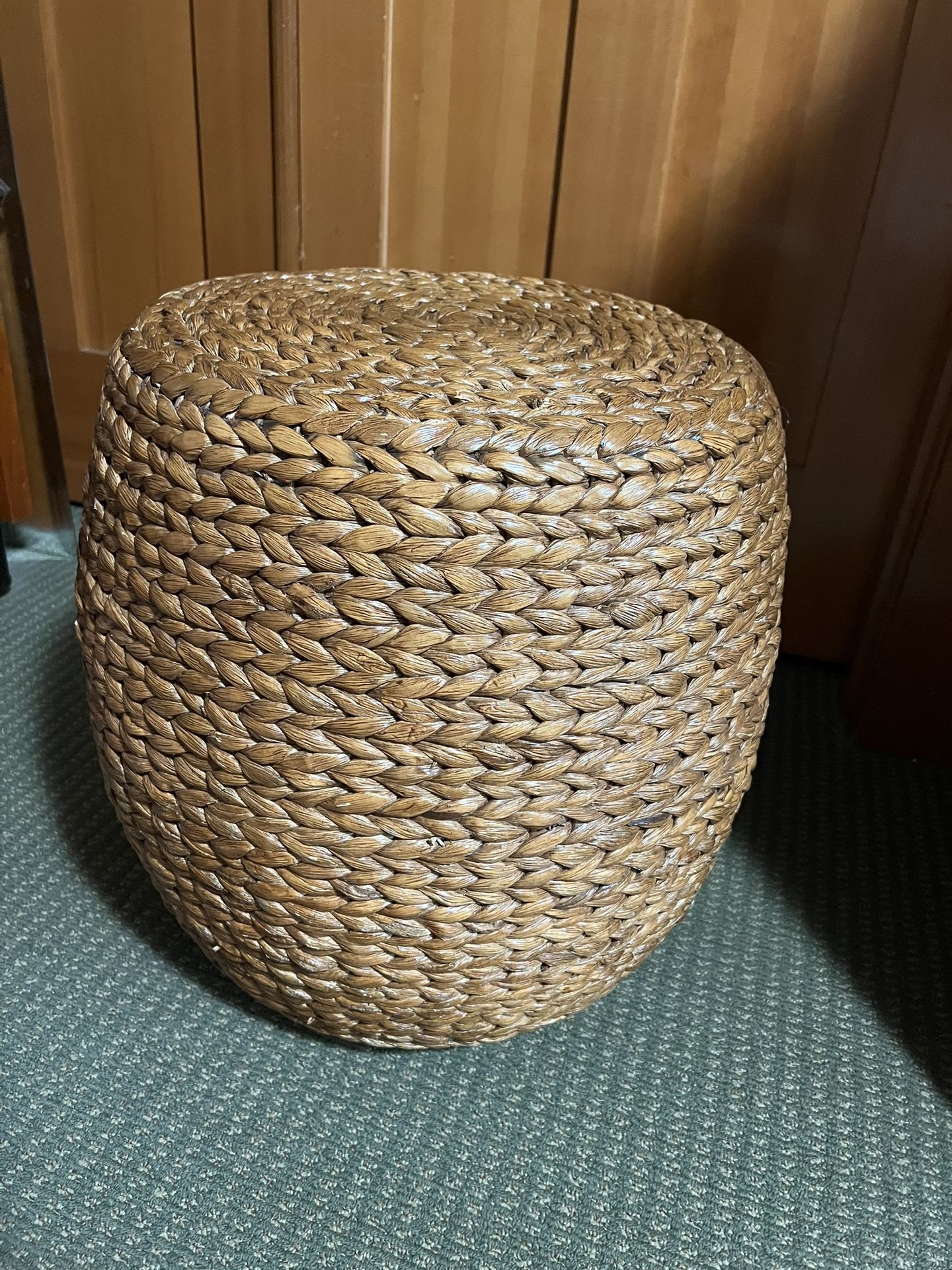Boho chic MCM vintage 1970s seagrass drum stool, very sturdy and well built . about 19 inch height x 17 inch width  Has beautiful solid wood short legs, and inner bamboo construction . Very good quality and in pristine vintage condition . Pottery barn has a similar stool newly made similar to this vintage one  for $300+ tax  as you can see in the last picture . Please porch pick up and cash payment thanks