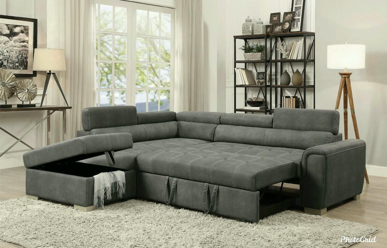 Brand New Grey Polished Microfiber Sectional With A Pull Out Bed Storage Ottoman & Adjustable Headrest