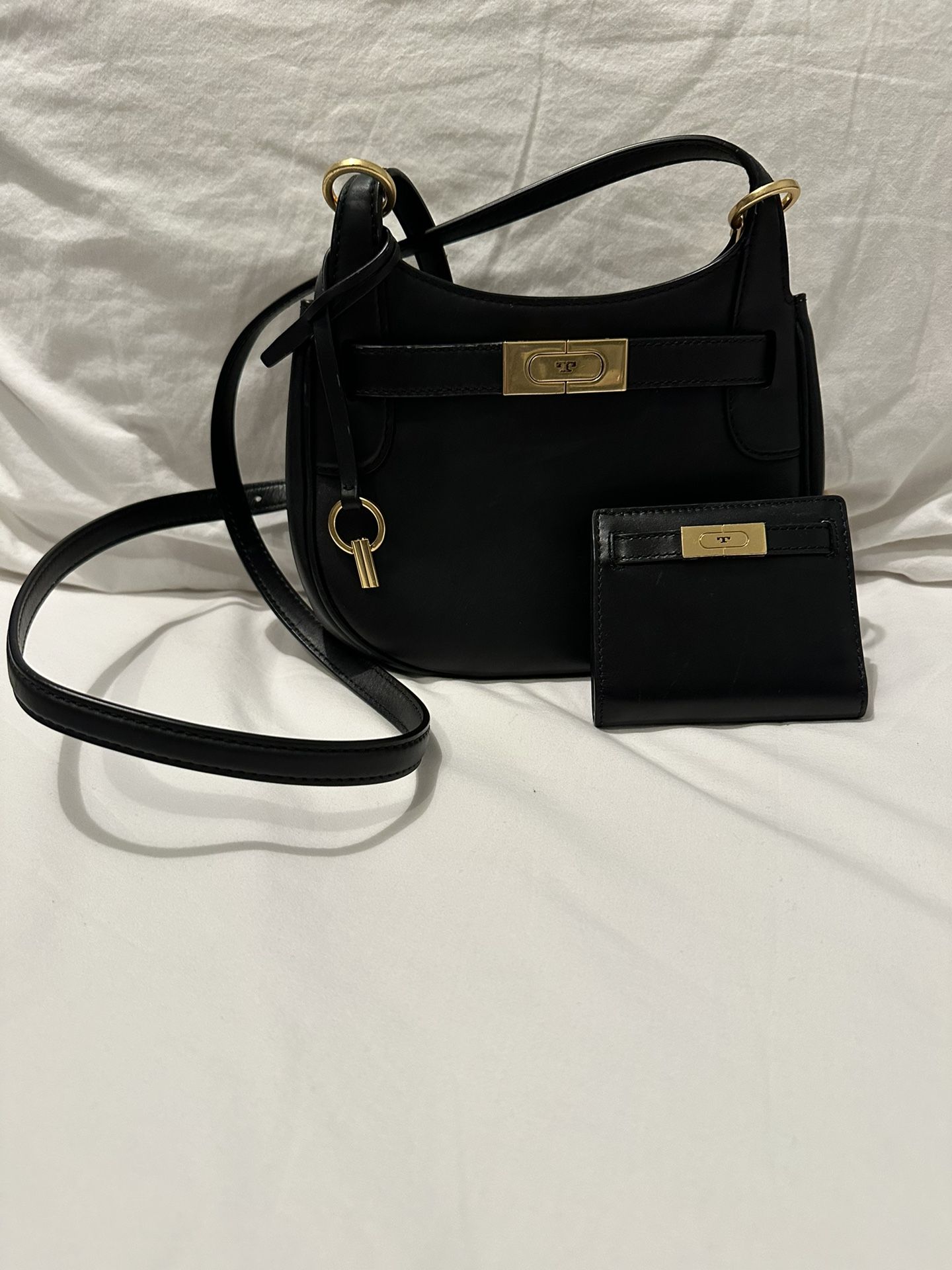 250 or BEST OFFER Tory Burch Women’s Lee Radziwill Small Saddle Bag Color Black Leather. The bag has no rips, tears or fraying just minor scoffs on leather Adjustable crossbody strap with 22.5" (56.5 cm) drop 1 exterior slit pocket; 2 interior slit pockets Flat bottom Approx measurements: Height: 8" (20 cm); length: 8.4" (21 cm); depth: 3.8" (9.2 cm) Tory Burch Lee Radziwill mini wallet is impeccably crafted in Italian leather and detailed with signature lock-and-key hardware. The collection is named for Lee Radziwill, a woman Tory always admired - she was fearlessly unique. Black - calf leather/lambskin logo plaque foldover top with snap fastening card slots Height: 3.6" (9 cm); length: 3.9" (10 cm); depth 1" (2.5 cm)