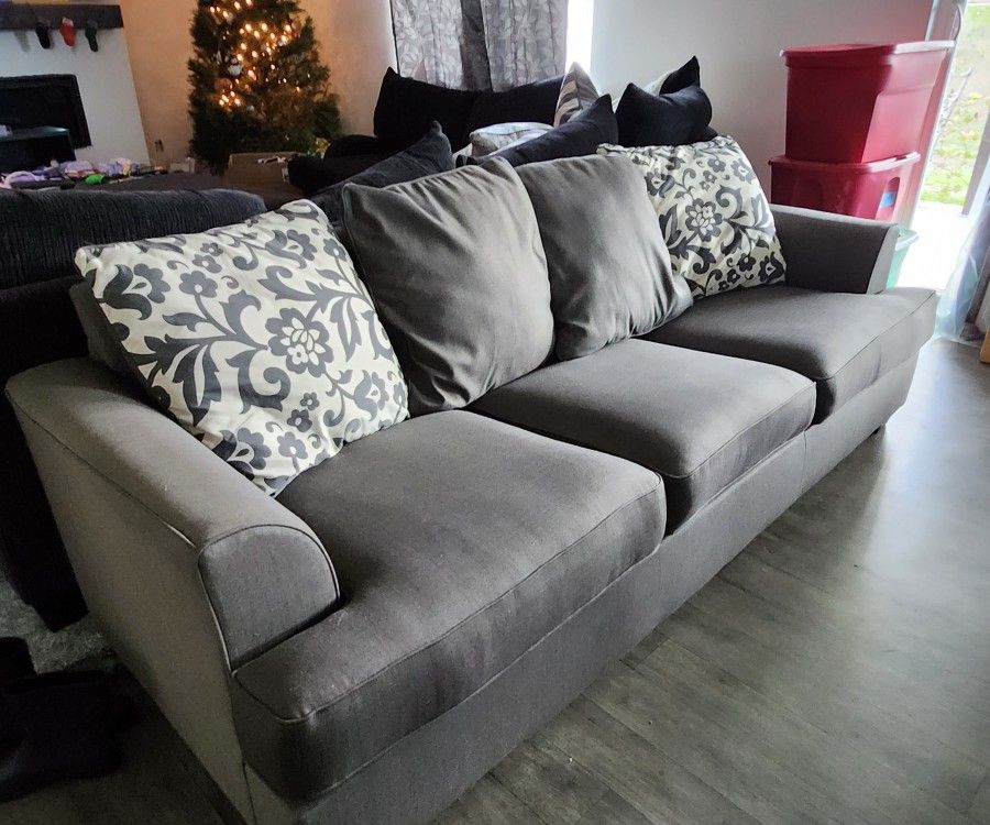 This is a great couch. Comfortable, clean, modern look with grey and damask style backing pillows. Not super heavy, easy to move. Make an offer