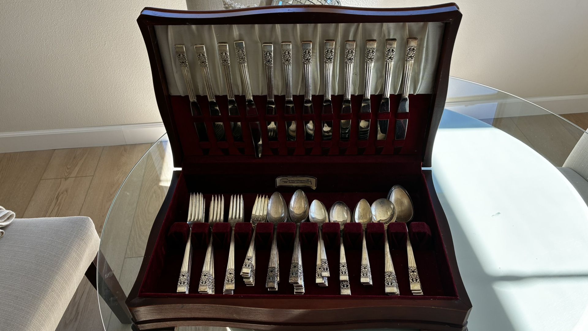 Coronation by Community Silverplate Vintage Flatware Set For 12 Service by Oneida LTD. Beautiful Hardwood case: Composition: Silver Plate - 18 Forks 8 Salad forks 12 Larger Spoons 18 Teaspoons 9 Soup Spoons 12 Butter Knives Case measures 20"W x 12-1/4"D x 4-1/8"H