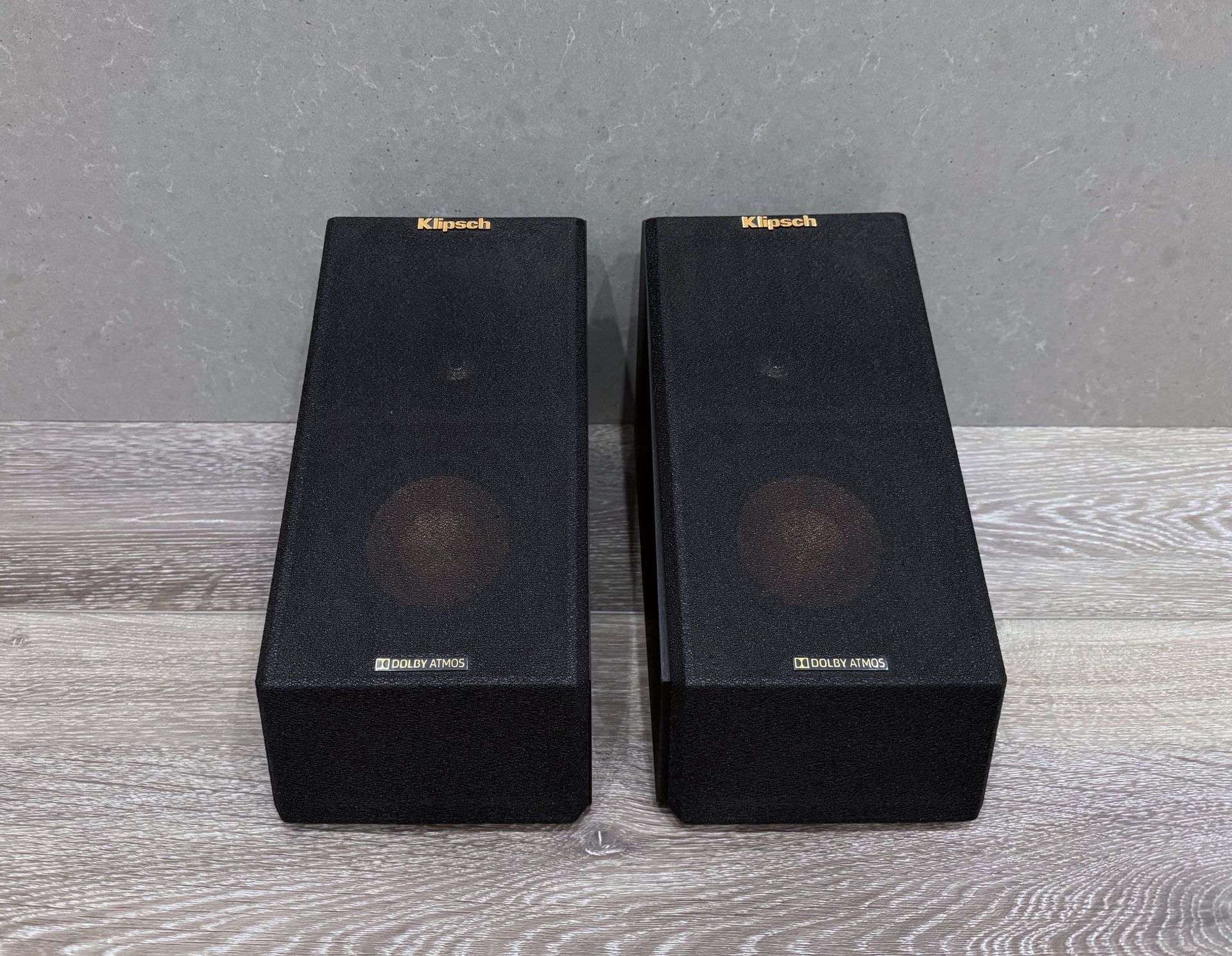 (2) Klipsch RP-140SA Atmos Speakers Tested and work excellent Adds Dolby Atmos® experience to any floorstanding/bookshelf speaker Can be used as surround speaker 1" Linear Travel Suspension Titanium Tweeter 4" Spun Copper Cerametallic Cone Woofers 90x90 Hybrid Tractrix Horn MDF Cabinet with Brushed Polymer Veneer Baffle Finish Strong, Flexible Removable Grille Dimensions: 7” x 6” x 11.25"