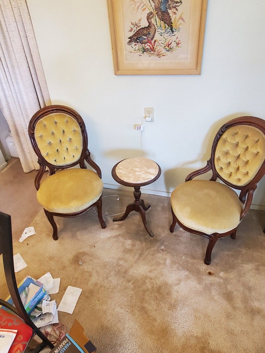 Victorian Tufted Chairs and marble Topped Tripod table