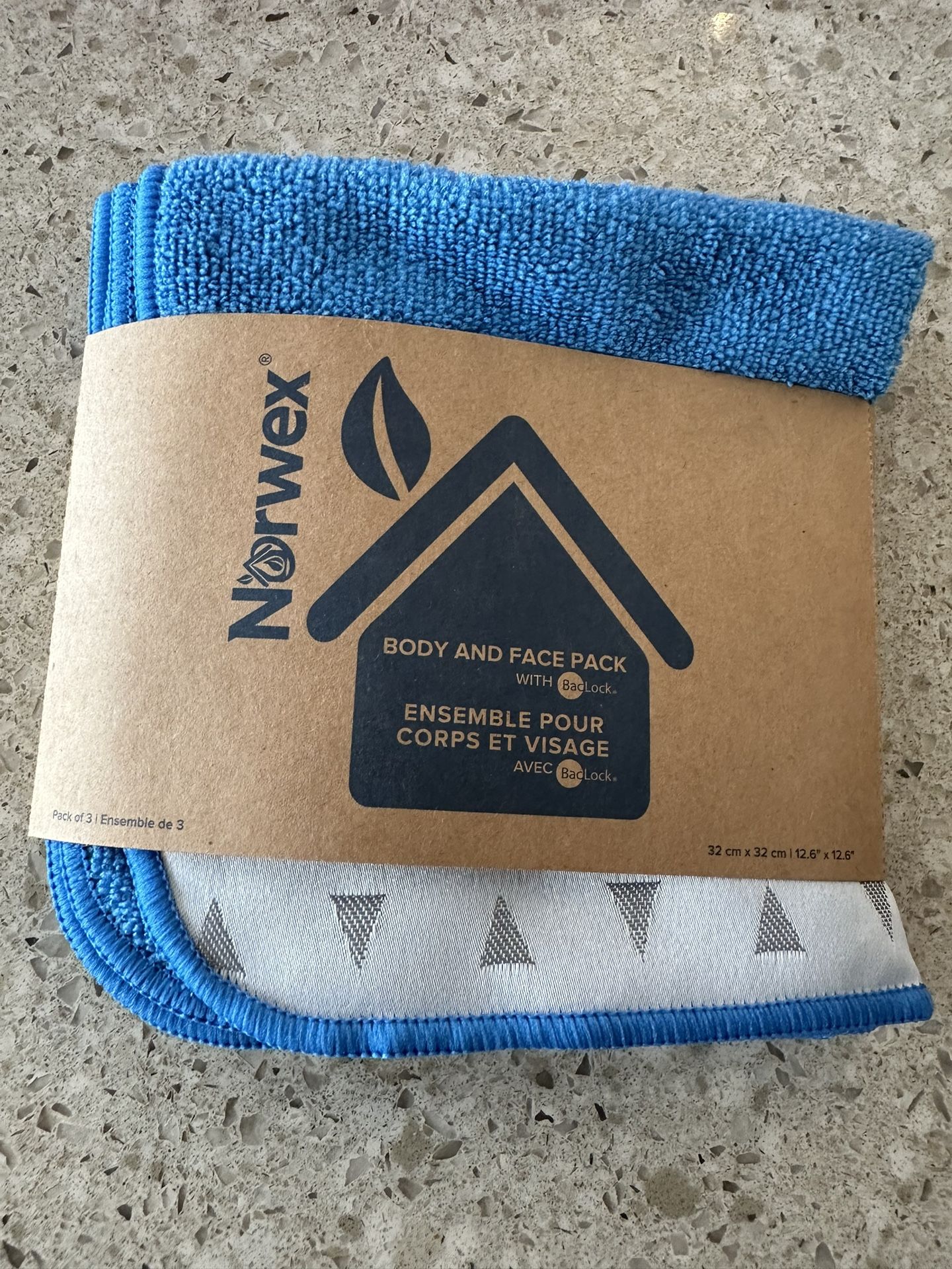 3 microfiber body/face cloths. Clean using just water and the cloth. Baclock keeps the cloths cleaner for longer.