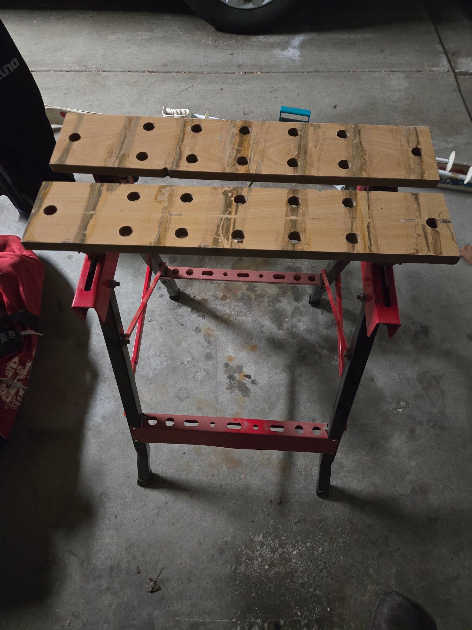 Folding Workbench / Portable Sawhorse – Heavy Duty Sturdy folding workbench with solid wood top and adjustable clamp-style holes. Folds flat for easy storage. Great for garage projects, DIY, woodworking, home repairs, or jobsite use. Details: • Heavy-duty steel frame • Solid wood work surface • Folds flat for storage • Stable and easy to set up • Normal garage wear, fully functional Plainfield pickup