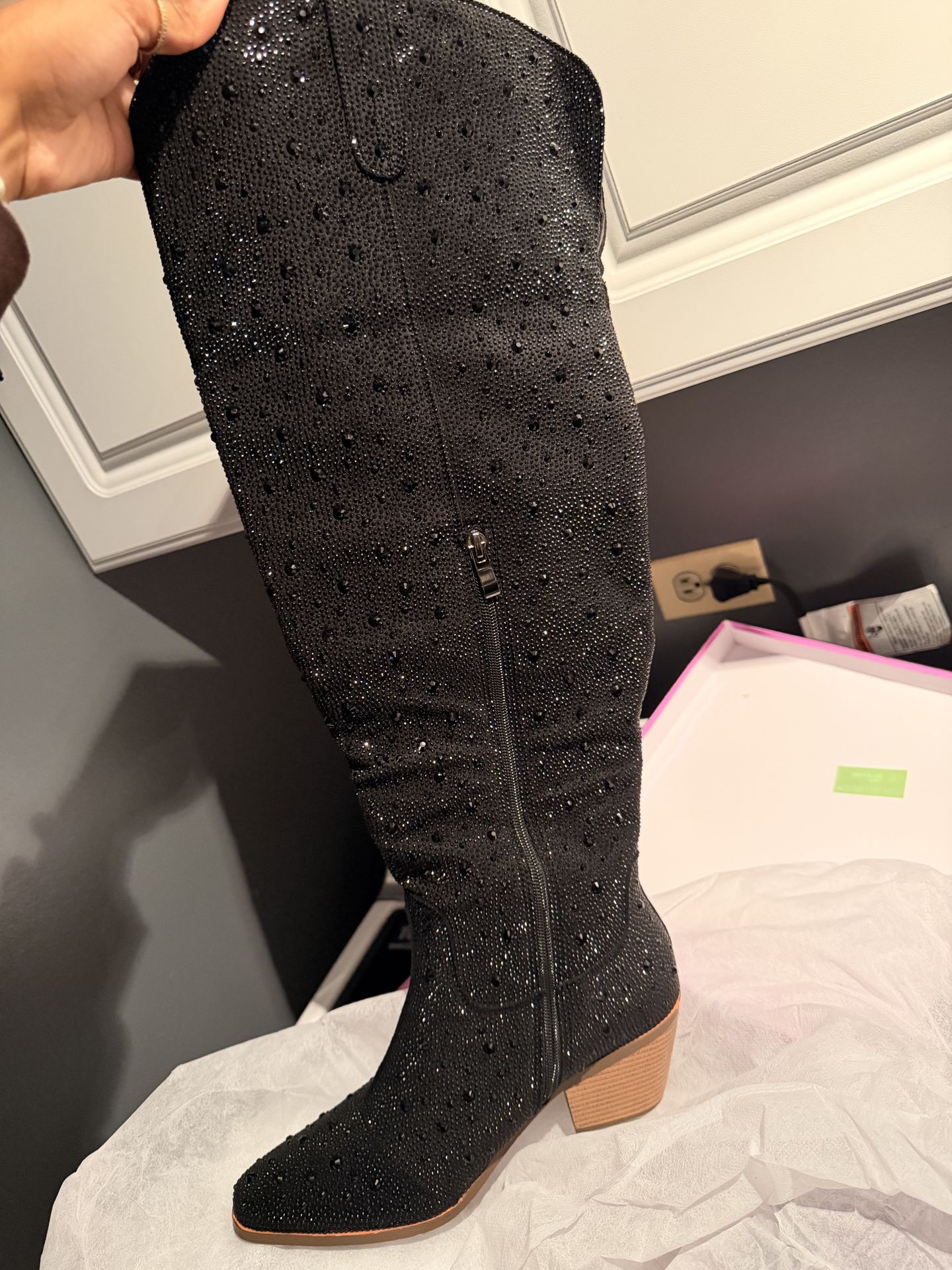Women Black Rhinestone Over the Knee Cowboy Boots