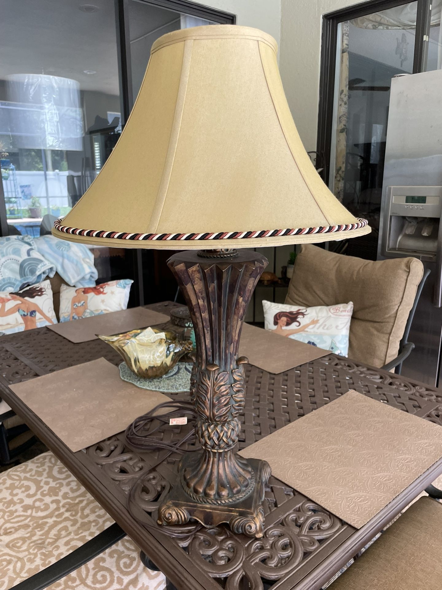 Very nice, sturdy lamp. It is not ceramic, perhaps resin? But it is nice and solid. Beautiful lamp shade. 31 inches tall, from bottom to the very top of the shade. Pick-up only in Mulberry, at Imperial Lakes Publix, or downtown Lakeland.