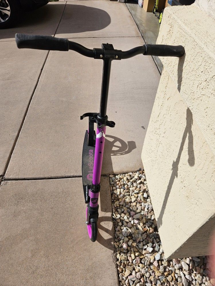 Gently used kick scooter in excellent condition. See pics for more details. Normally sells for $80 brand new. Selling for $50, cash price firm, you pick up. Features: -Lightweight Aluminum alloy frame -LATTA suspension technology offers a smooth ride. Low vibration and high-impact shock absorption combine with wear-resistant PU wheels to minimize bumps. -Extra-wide, non-slip deck provides great stability for riders while the aluminum brakes yield optimized and long-lasting braking power for an optimal driving experience -This big wheel scooter includes a patented push button folding mechanism and a kickstand. Portable and easy to store, the LaScoota’s scooter is suitable for people on the go. -Designed to accommodate most heights, the handlebar is adjustable 32" -39” in. Supports weight up to 220 lbs.