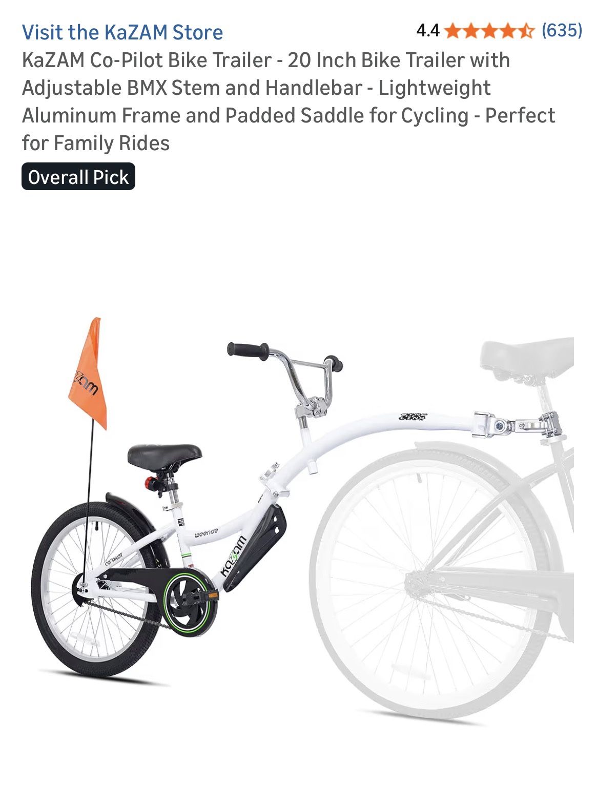 20” bike trailer that attaches to most adult bikes. Folds up for easy storage. Strong steel frame with air tire for a smooth ride. Comfortable padded seat and adjustable handlebars. Easy to attach and remove. Great for riding with a child.