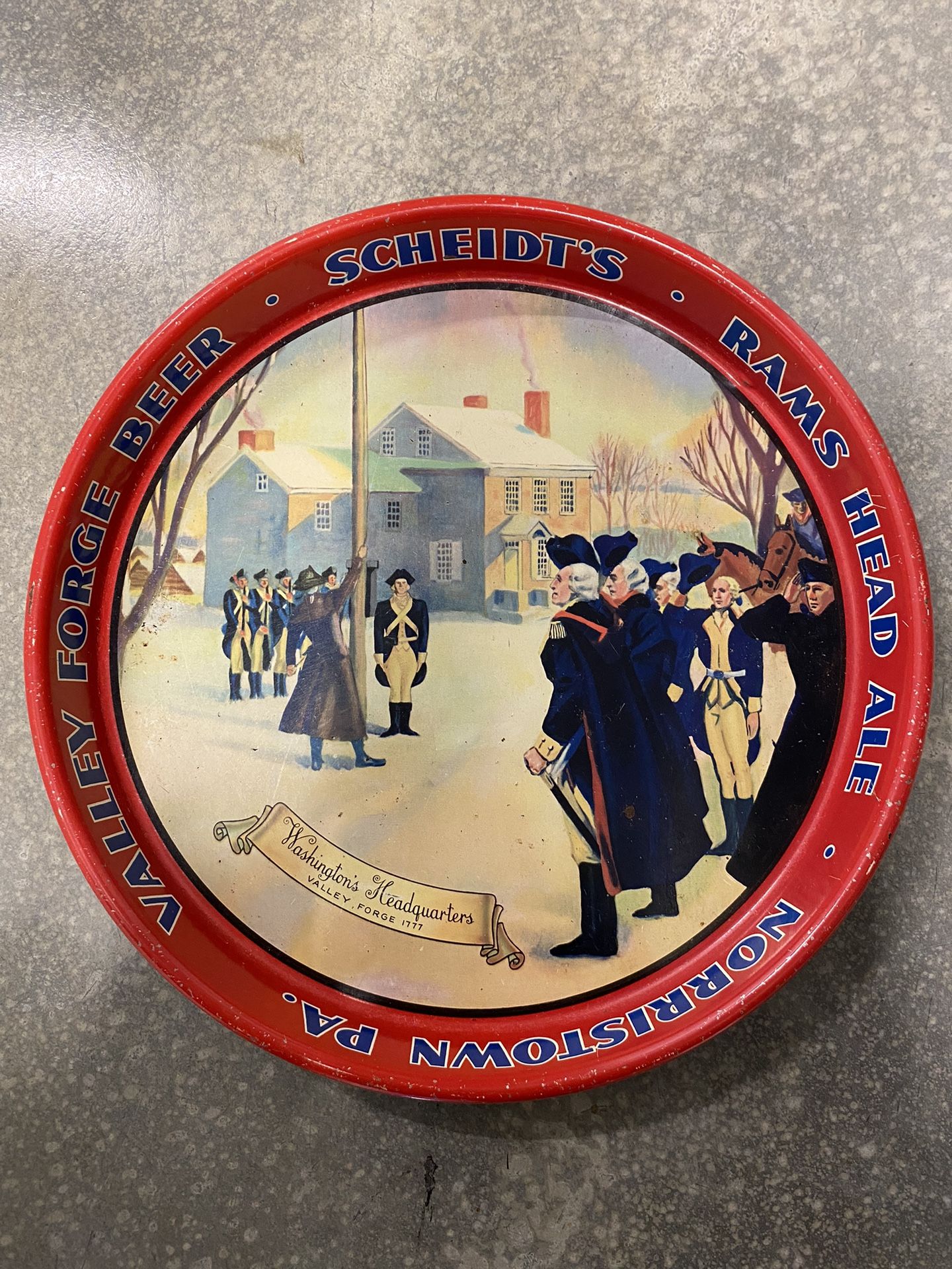 VINTAGE Valley Forge Beer Tray. 12" Round Red Metal Tray