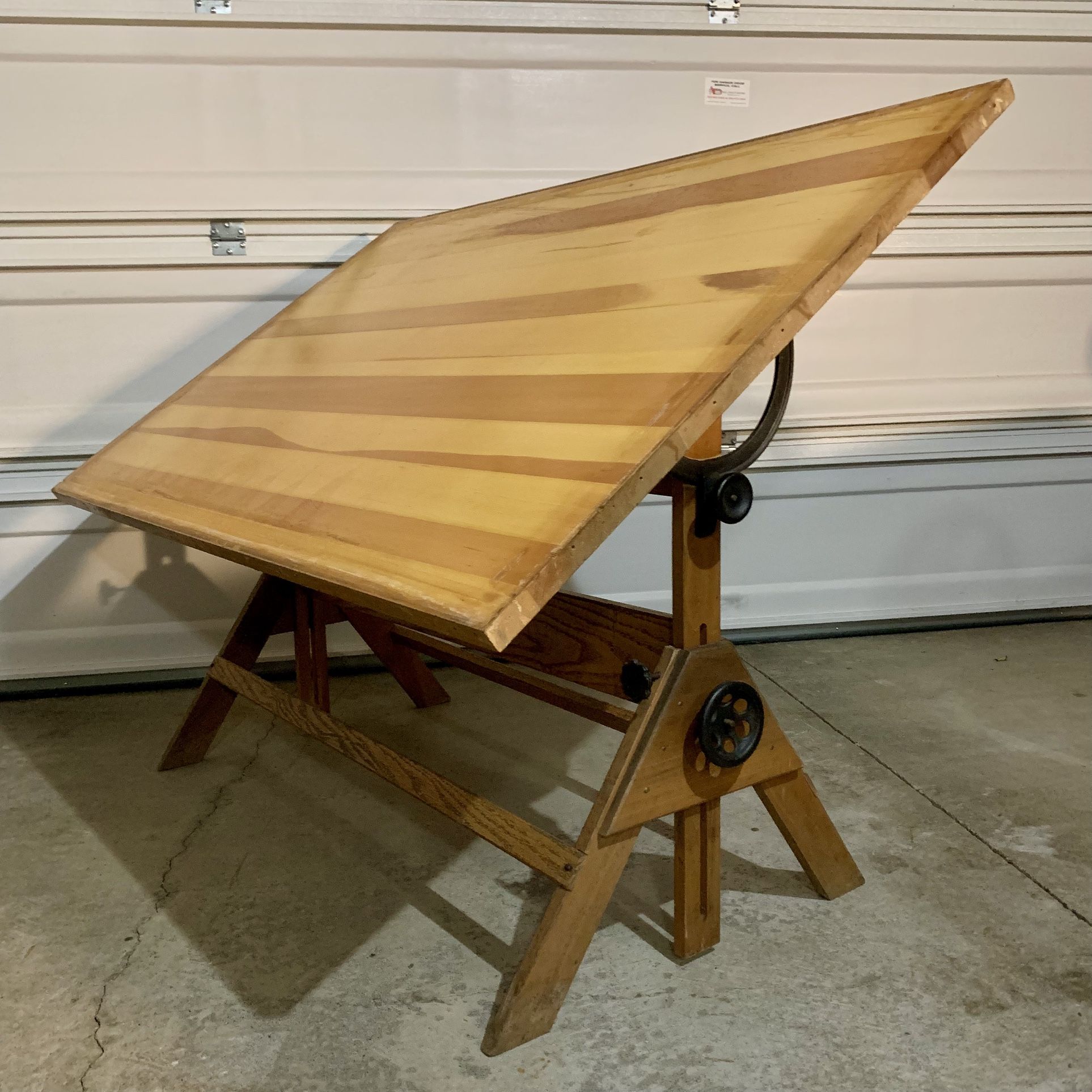 This is an amazing Anco Bilt drafting table from the mid 1900’s. This will make an amazing sit / stand desk, game table, art table, kitchen island, dining room table, easel, or whatever creative idea you have. The solid wood table top is in great condition and looks amazing! The table base is made from solid oak and has all the cast iron hardware and original threaded knobs. It is completely adjustable. The table top can be raised and lowered and tilts in both directions. The table measures 5’ wide and just over 3’ deep (38”). The height can be adjusted from 32” to 42” inches tall. I can deliver for free within a reasonable distance. Cash is preferred.