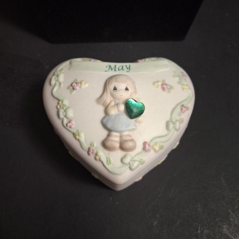 Collectible Precious Moments May Birthday Heart Covered Keepsake Box With Faux Emerald "Color Of New Life, Conveys Harmony, Freshness & Beauty"