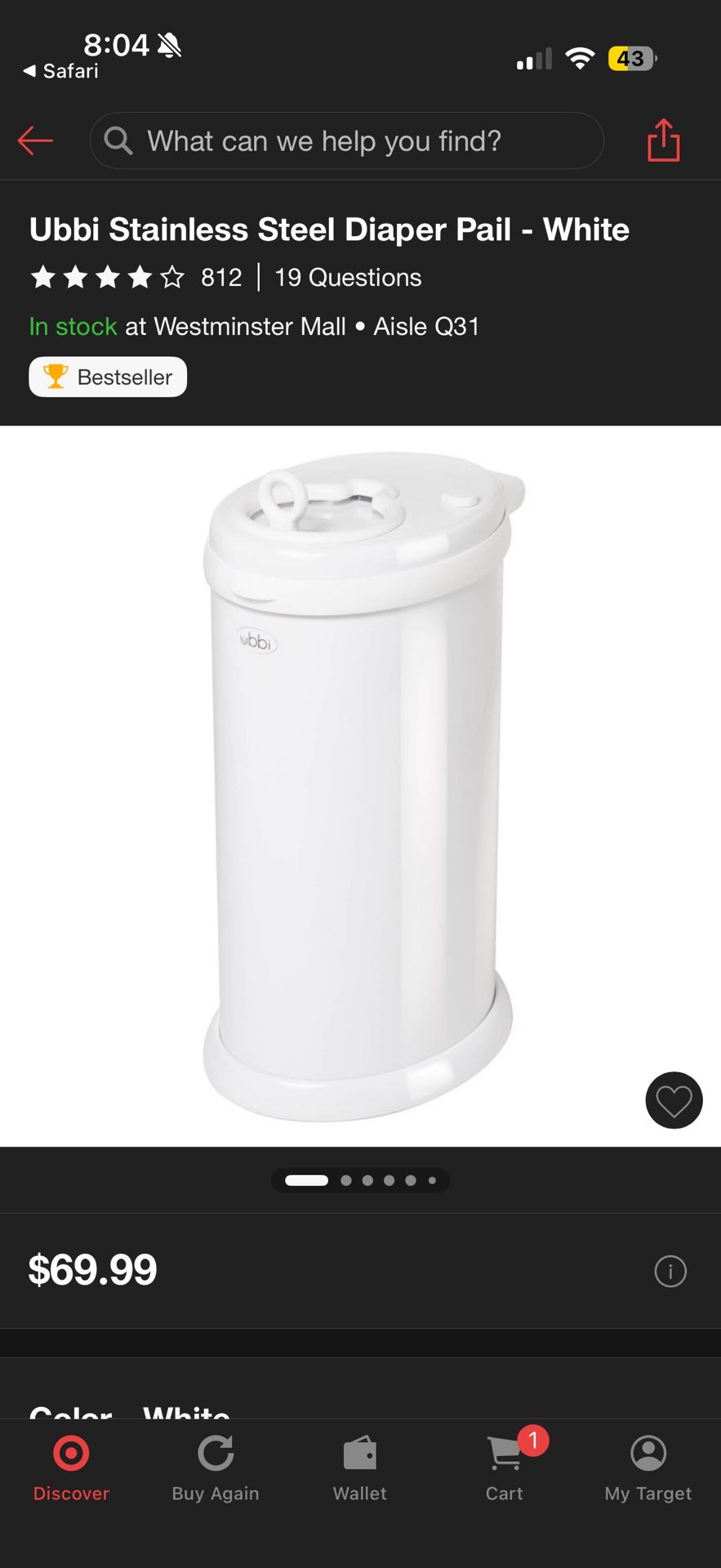 UBBI Diaper Pail! Used like new! No smell. No dents.