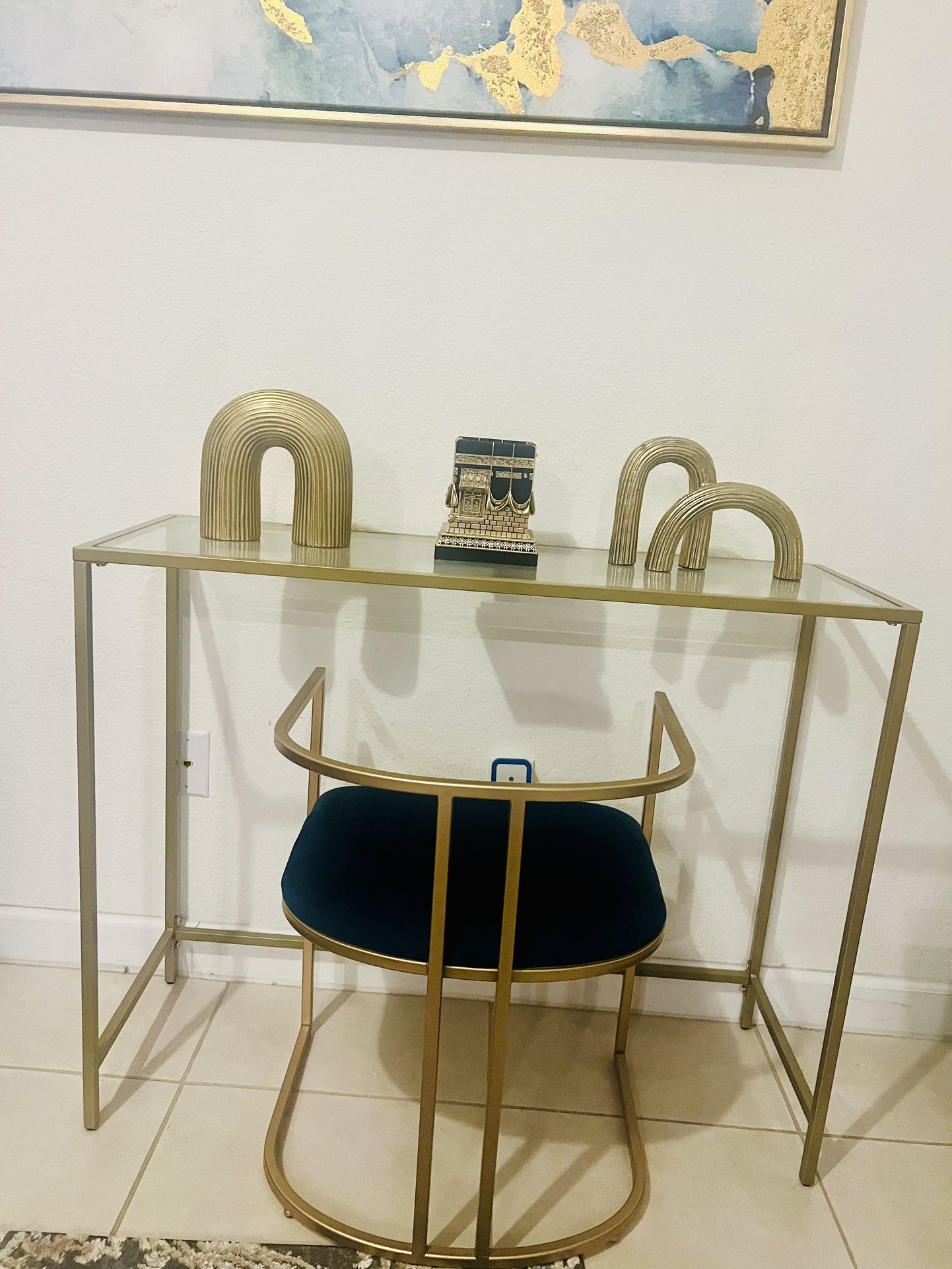 Gold glass table and gold blue chair