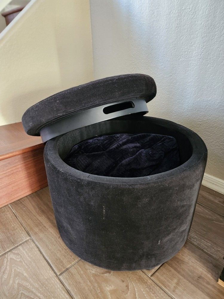 Sturdy Ottoman With Storage Round shape Black color Cushioned seat Approximate measurements - Height - 14 inch Diameter - 18 inch Many household stuff on moving sale, check my profile for more detail.
