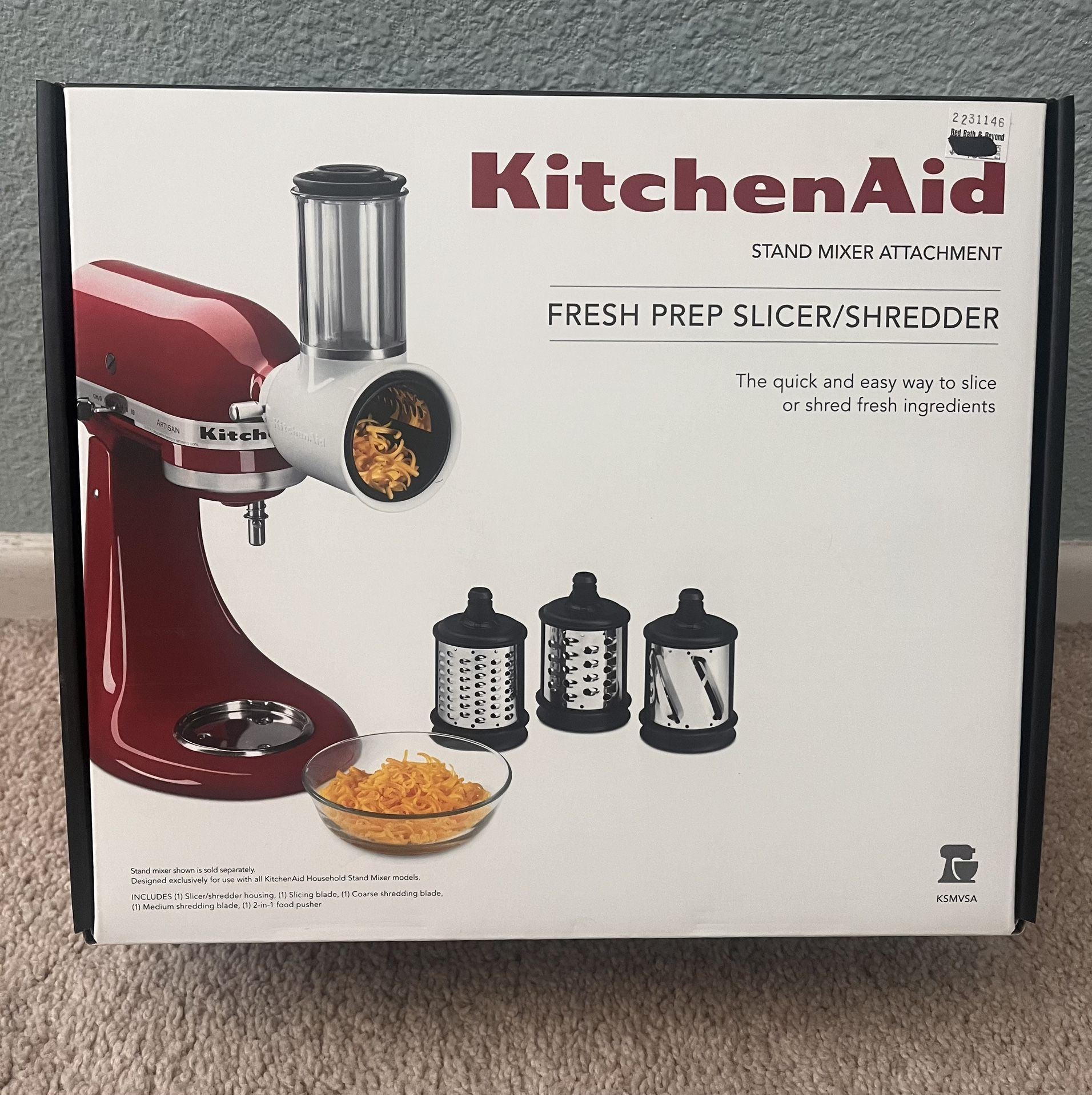 This attaches to the power hub of your KitchenAid stand mixer and comes equipped with three blades, offering endless slicing and shredding possibilities. Only used once.