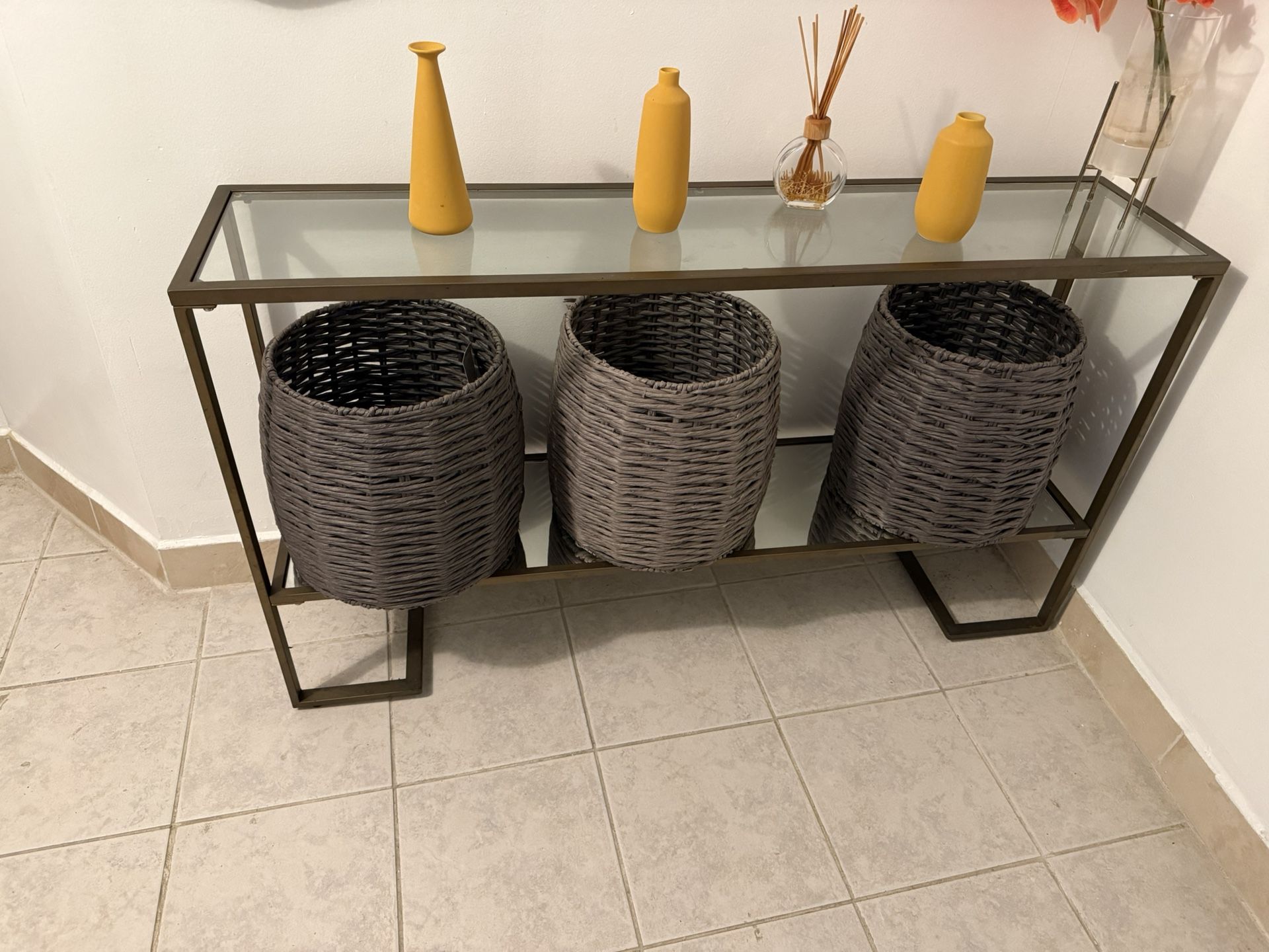 Beautiful and stylish console table with glass top and matching 3 woven storage baskets included. Only 1 year used and in excellent condition. 🪑 Details: • Tempered glass top • Sturdy metal frame (bronze/dark finish) • Bottom glass shelf • Includes 3 large woven baskets 🗄️ Features: • Perfect for entryway, hallway, living room, or dining area • Great for extra storage (blankets, shoes, toys, decor, etc.) • Modern and elegant design • Clean and well maintained No cracks in the glass and frame is solid. Baskets are in great shape. Ready for pickup!