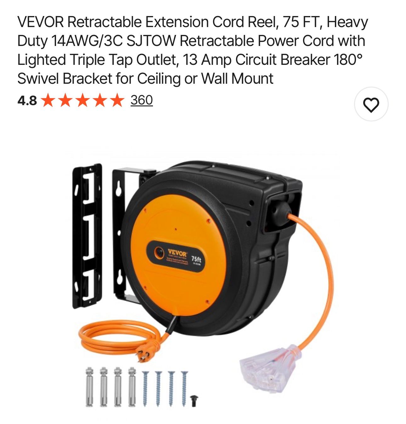 VEVOR Retractable Extension Cord Reel, 75 FT