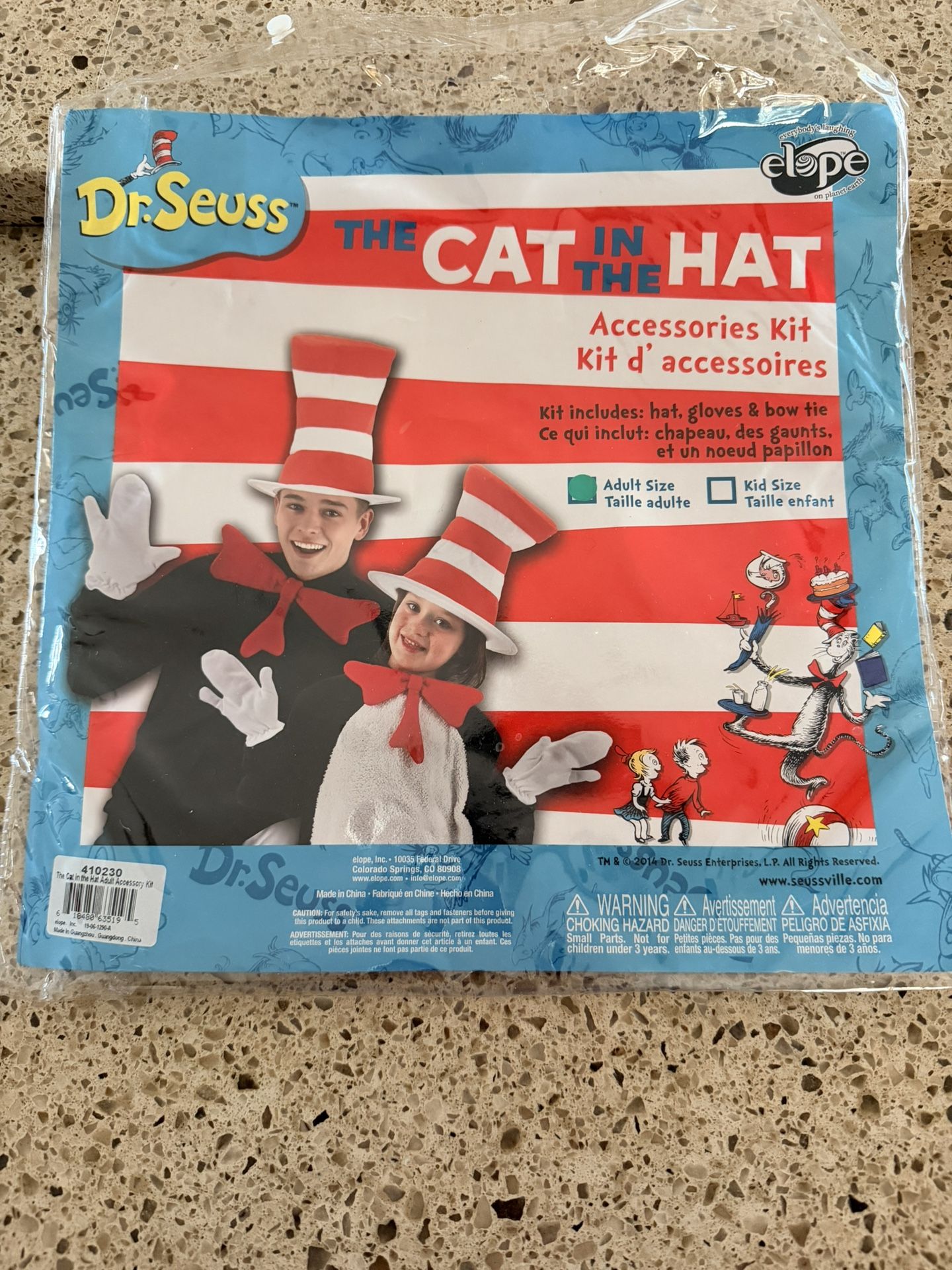 Fun Dr. Seuss accessory kit. Includes hat, gloves, and bow tie.