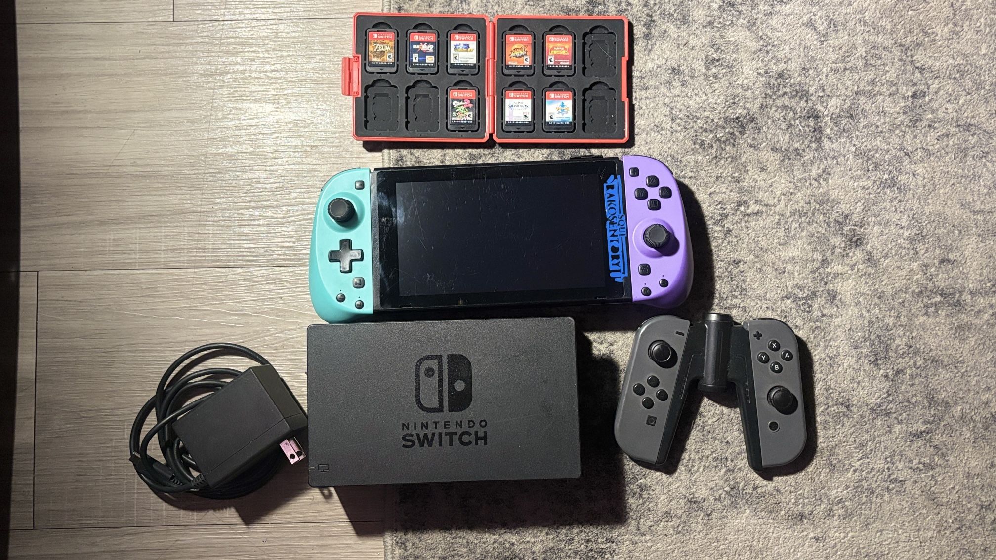 Console + Accessories • Nintendo Switch (V1/V2) • Original Dock • Power Charger • Extra Gray Joy-Cons • Color Joy-Cons (teal + purple) • Game card hard case Physical Games Included (9 total) Zelda: Breath of the Wild $45 Dragon Ball Xenoverse 2 $35 Pokkén Tournament DX $40 Mario Strikers Battle League $40 Pokémon Scarlet $45 Splatoon 2 $35 Super Smash Bros Ultimate $45 Pokémon Sword $45