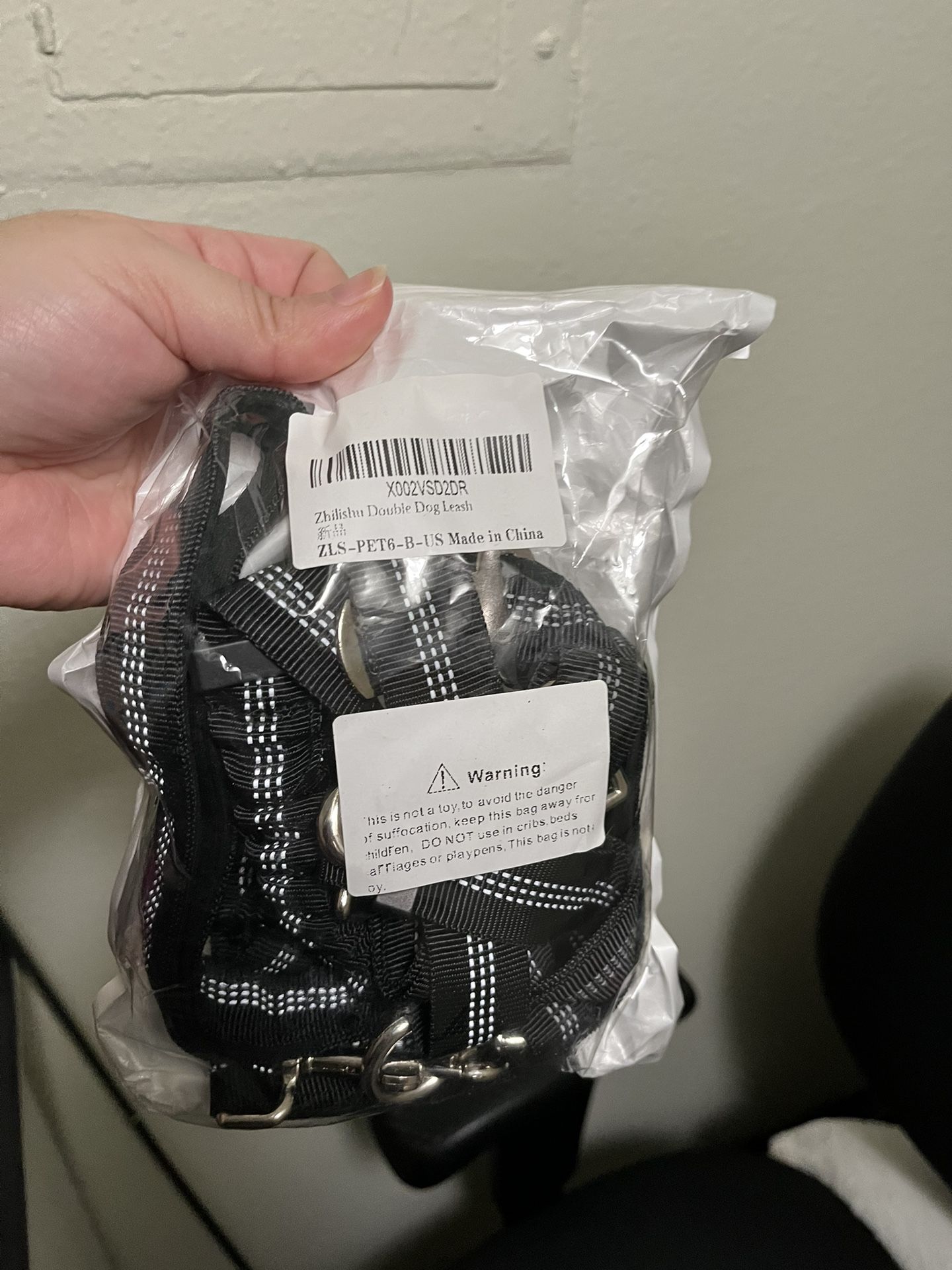 New never used. Way too bulky for my tiny dogs. Dual dog leash with seatbelt connection and two padded handles. $15
