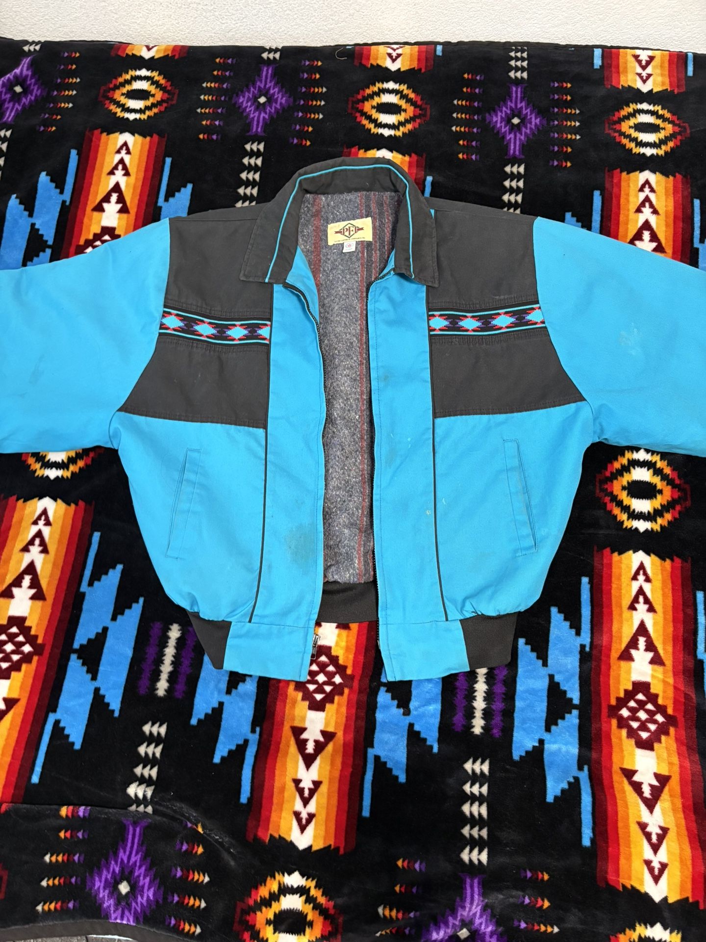 Selling a vintage 90s PFI Westernwear Southwestern Aztec jacket. Teal and black colorway with woven Aztec pattern across the chest. Made in USA and blanket lined for warmth. Tagged size XL, but it fits closer to a Medium/Large in today’s sizing. It does NOT fit like a modern XL Features: • Full zip front • Southwestern / Aztec chest bands • Blanket-lined interior • Made in USA • Classic 90s Western style There are visible stains/discoloration on the front (see photos), including darker areas near the lower center zipper and a lighter mark on the lower right front panel. No rips or structural damage. Zipper works perfectly. Perfect for Western wear, ranch style, cowboy aesthetic, 90s streetwear, or Southwest vintage collectors.