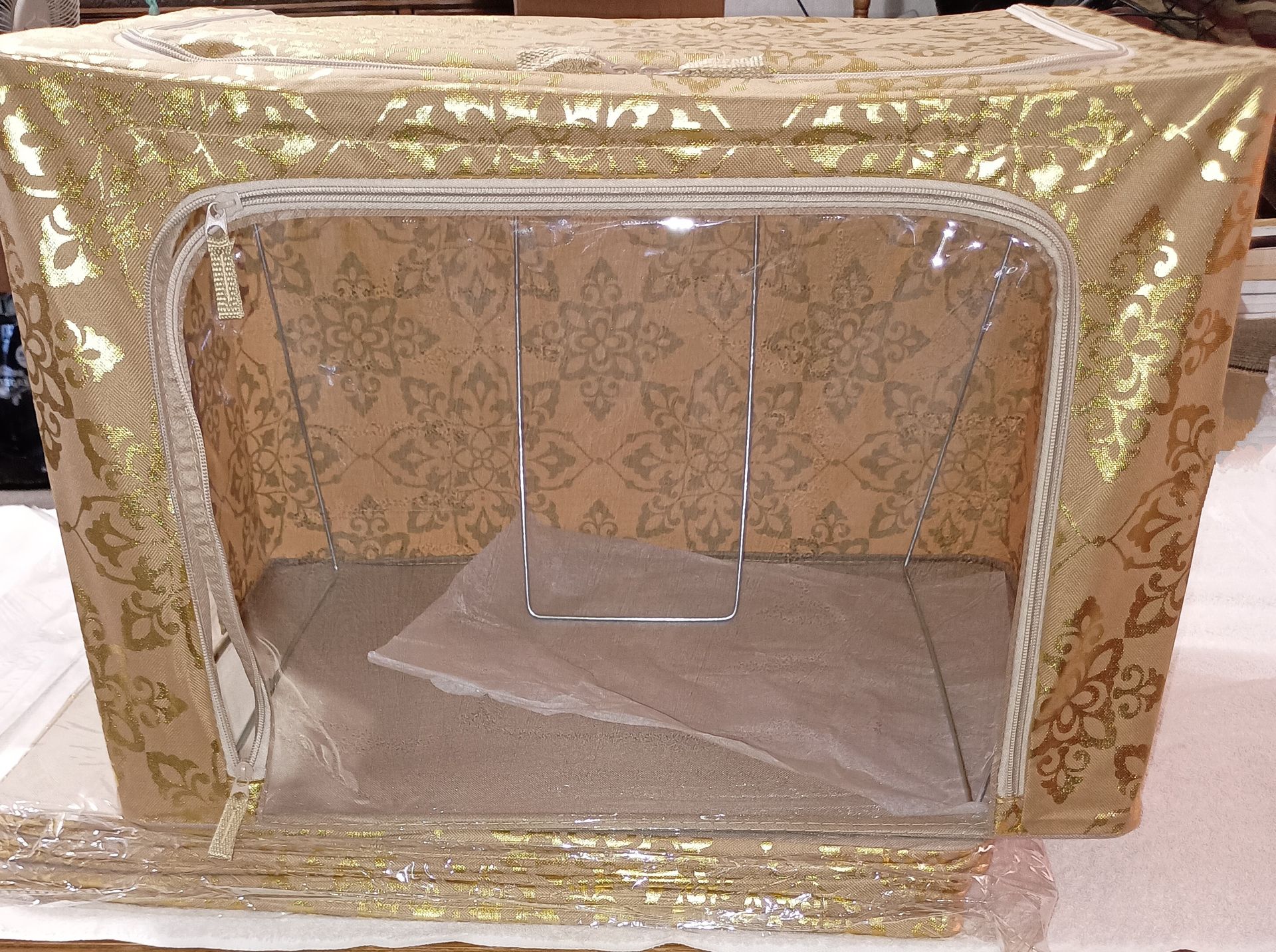 NIB 4 Box Set Tidy & Co. Gold Damask Pattern Zipper Storage Boxes with plastic windows. Measurements 22x16x15" Brand = Tidy & Co. Gold Damask Pattern Zipper openings Fabric storage bags for closet organization and storage Reinforced metal frame to hold up to 40lbs each