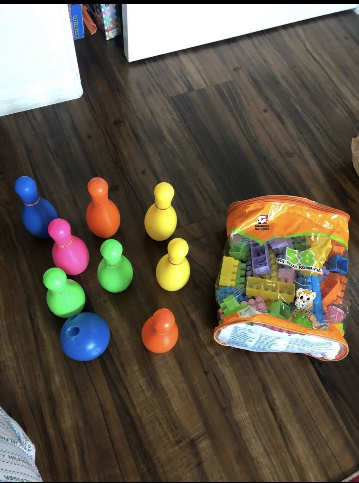 1. This is a lot of building blocks in good condition. There are 56 pieces. 2. Bowling set