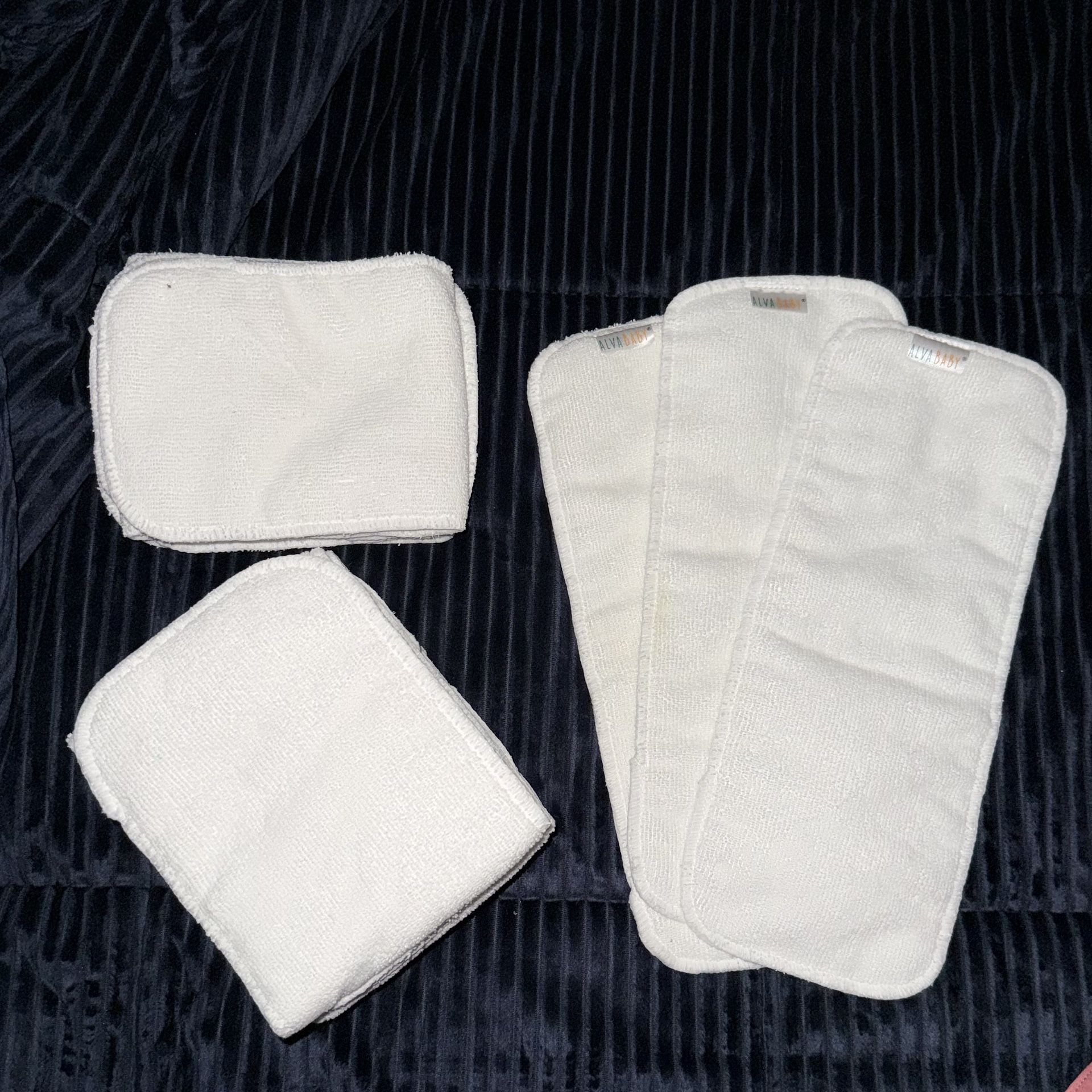 Everything is one size ALVABABY microfiber inserts - used no more than 2 times - no damages or stains 12 inserts total for $15 ~ Nora’s Nursery Pocket diapers - used no more than 10 times - no damages or stains $30 for all 9 or $3 each Checkout my profile for more baby stuff Visita mi perfil para mas cosas para bebe #: pink, purple, flower, girl, plants, green