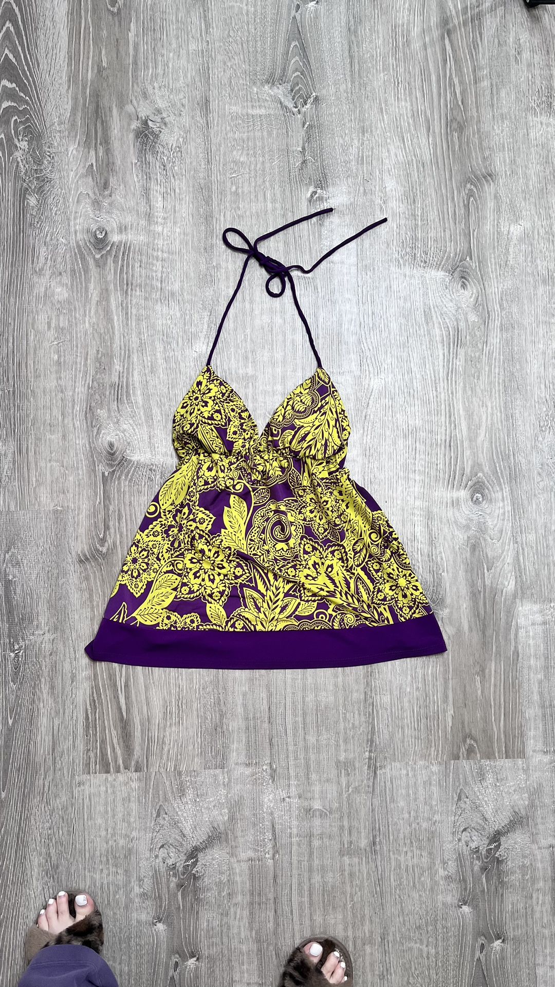 Charlotte Russe Small Purple and Neon Yellow Paisley Print Boho Halter Tank Top BOHO