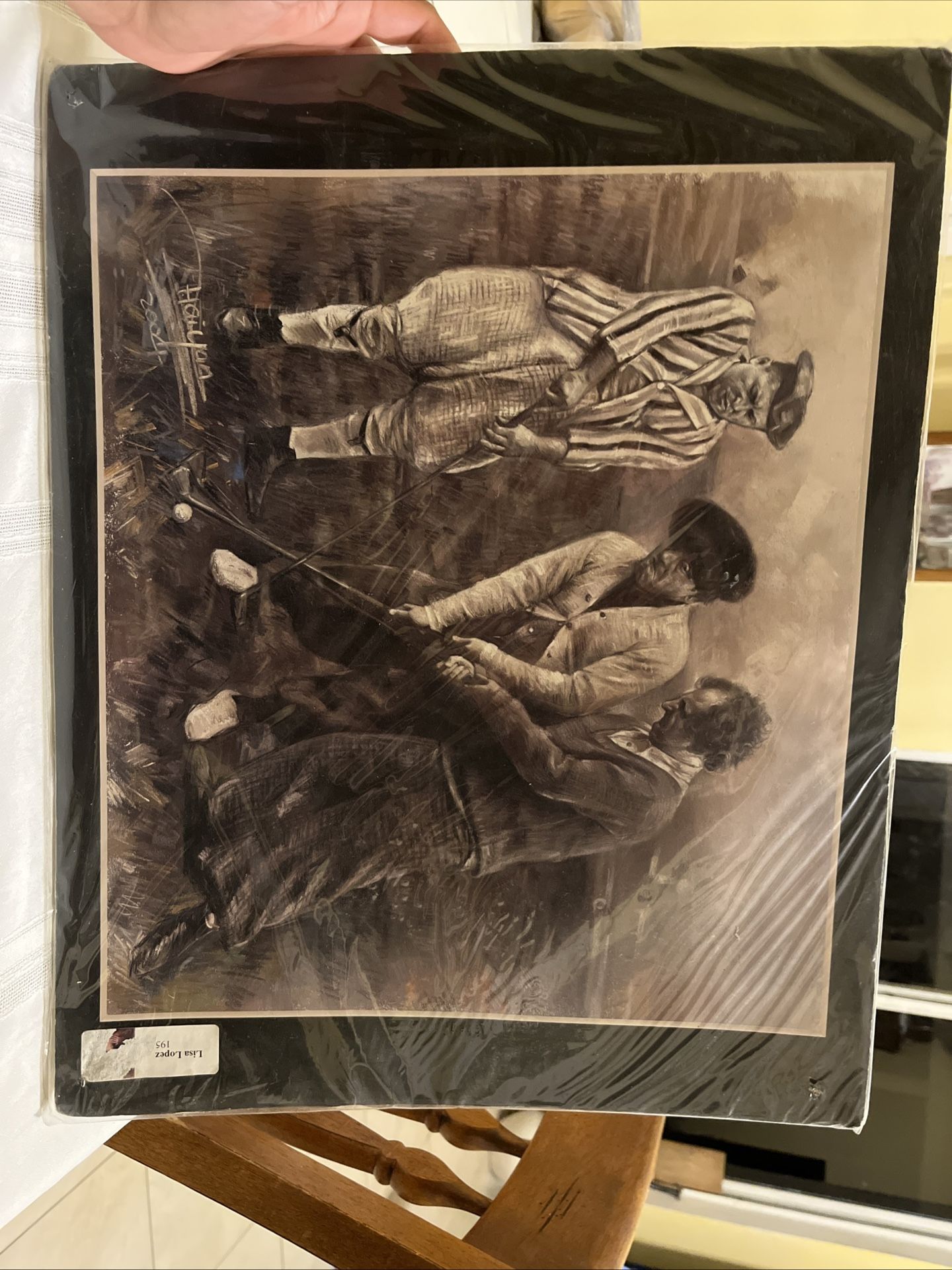 This 16x14 print by Haiyan in 2004 depicts The Three Stooges playing golf. The print is perfect for fans of the classic comedy trio. It features a high-quality image that is sure to be a conversation starter in any room. In a plastic cover with a black border and foam type back. It is ready for frame and display. Print is in great condition, but edges are not perfect, and black border covers that. The print is categorized under art prints and falls under the art category. It is a used item, but its condition does not affect its appeal and functionality. The print is an excellent addition to any collection and a great gift for any fan of The Three Stooges.