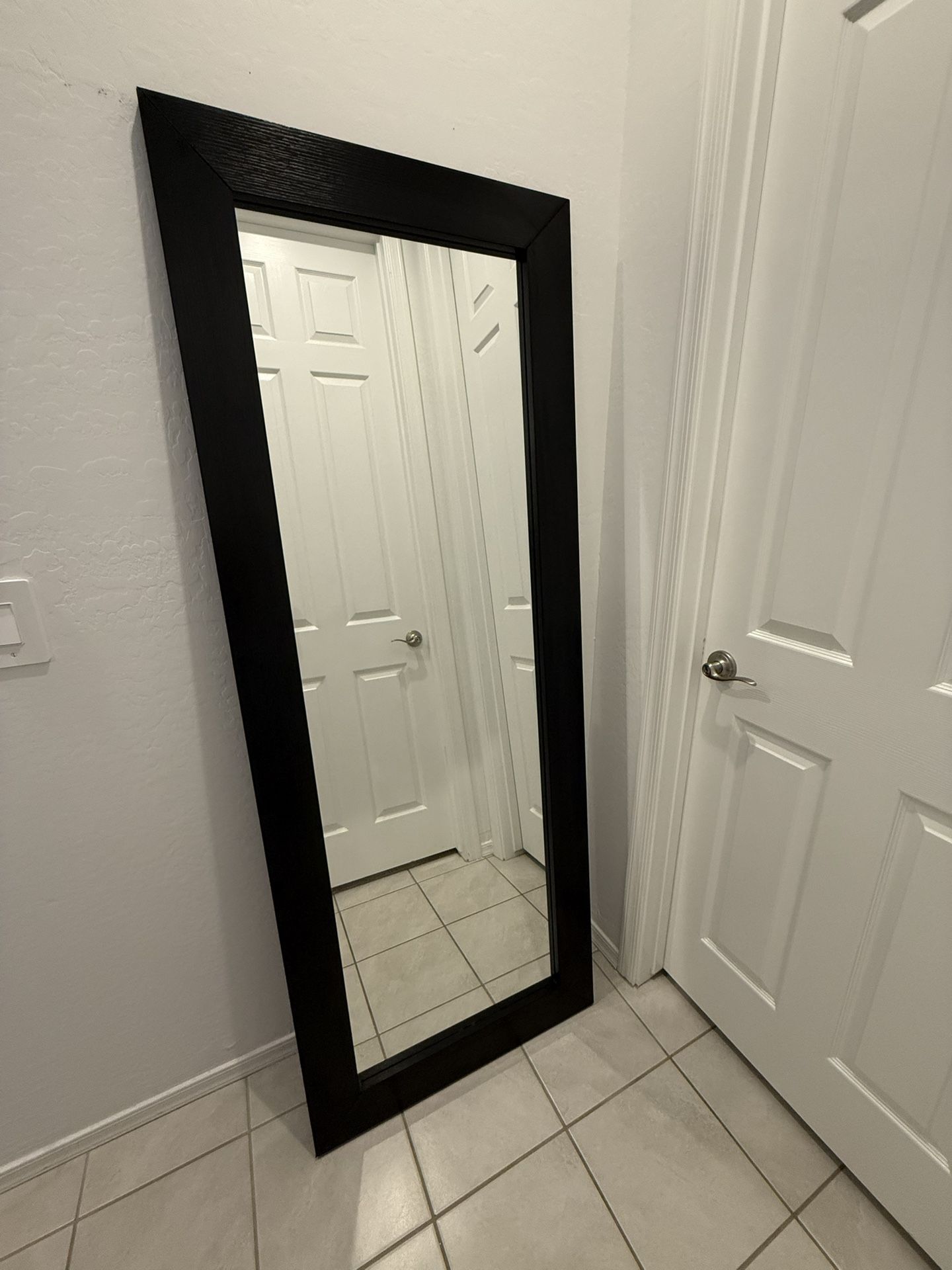 27 and a half inches wide, 70 inches tall Used but good condition!! -No damage -No scratches -Mirror not shattered/no scratches -Has thingy on back to place on the floor -Can be placed against wall