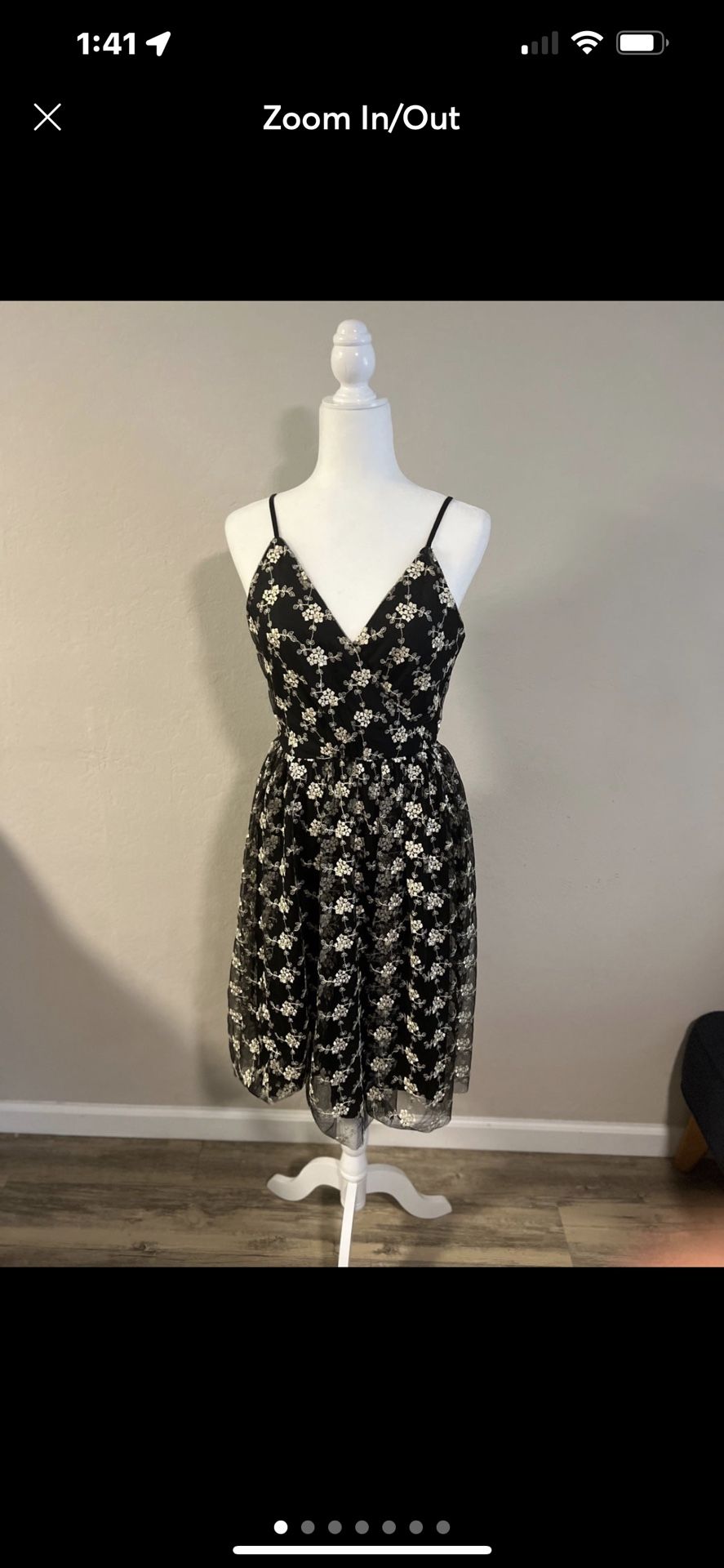 Black mesh with gold flower embroidery.