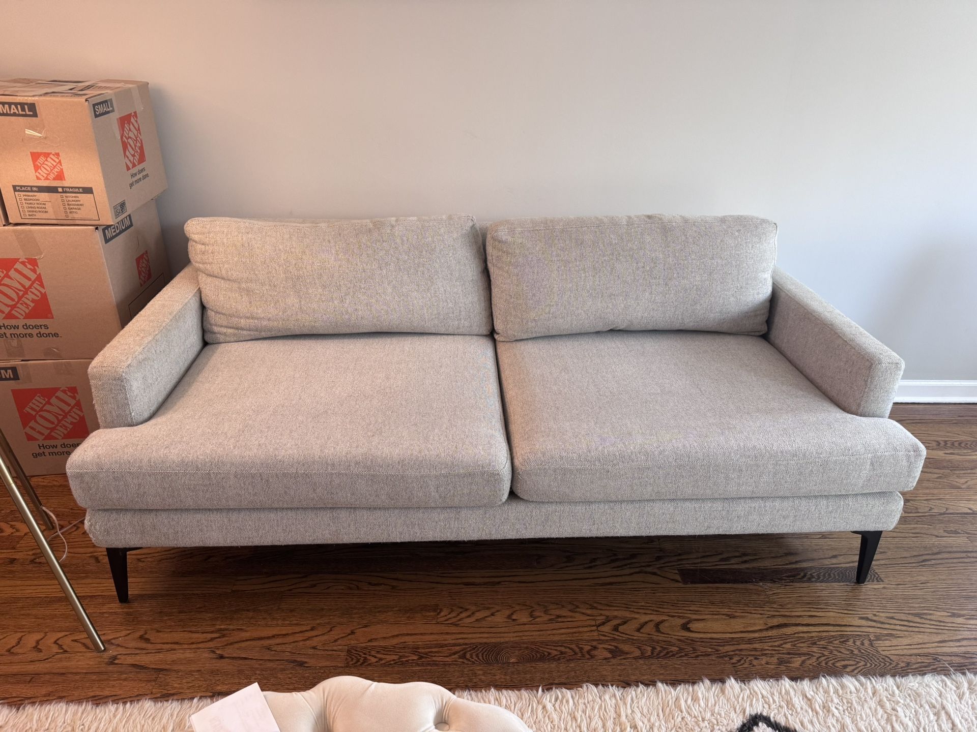 West Elm couch 75 inches long 39 inches deep and 29 inches tall-I’m moving. It’s the only reason I’m selling it. it’s not very heavy at all. It’s in very good shape. It’s wide enough to be a twin bed when you take the back cushions off. The cushions covers can be dry cleaned. I have dry cleaned them many times to keep it in good shape. I am moving- make me an offer. You will need to come pick this up!