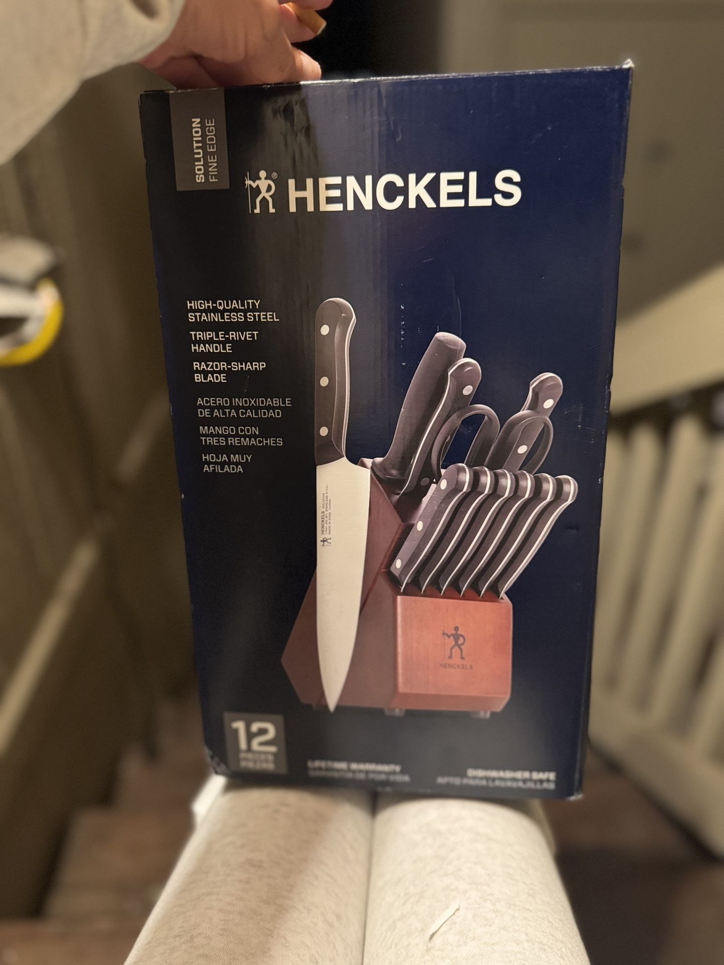 Brand New Never Been Open Box Of 12 Henckels Kitchen Knifes With Block. Dish Washer Safe 4” pairing knife 5” serrated knife 8” chef’s knife 6- 4.5” steak knife 8” honing steel Kitchen shears 11 slot knofe block