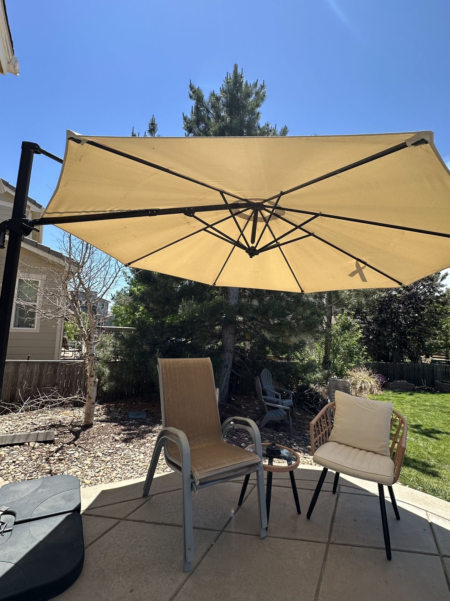 10 ft cantilever umbrella with 360 rotation. Used, but well taken care of($189 retail).Comes with 4 piece cantilever base that can be filled with water or sand(retail $70). Must pick up.