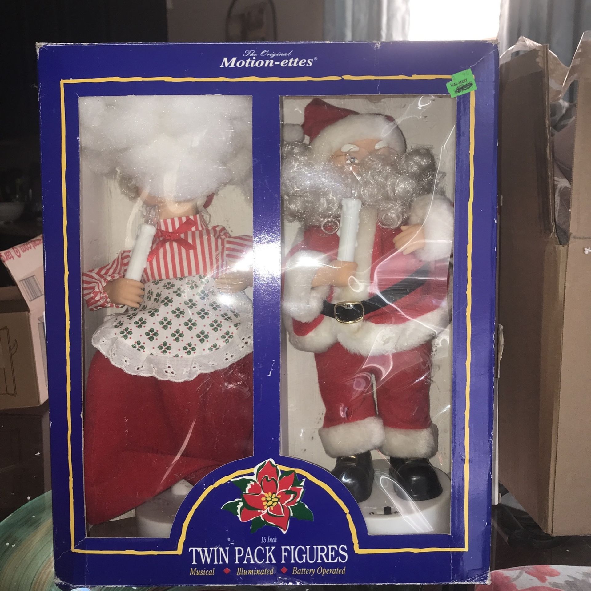 Motion-ettes 15”musical Illuminated battery operated r and misses Claus with snow at there feet. No plugs just put in batteries and go.