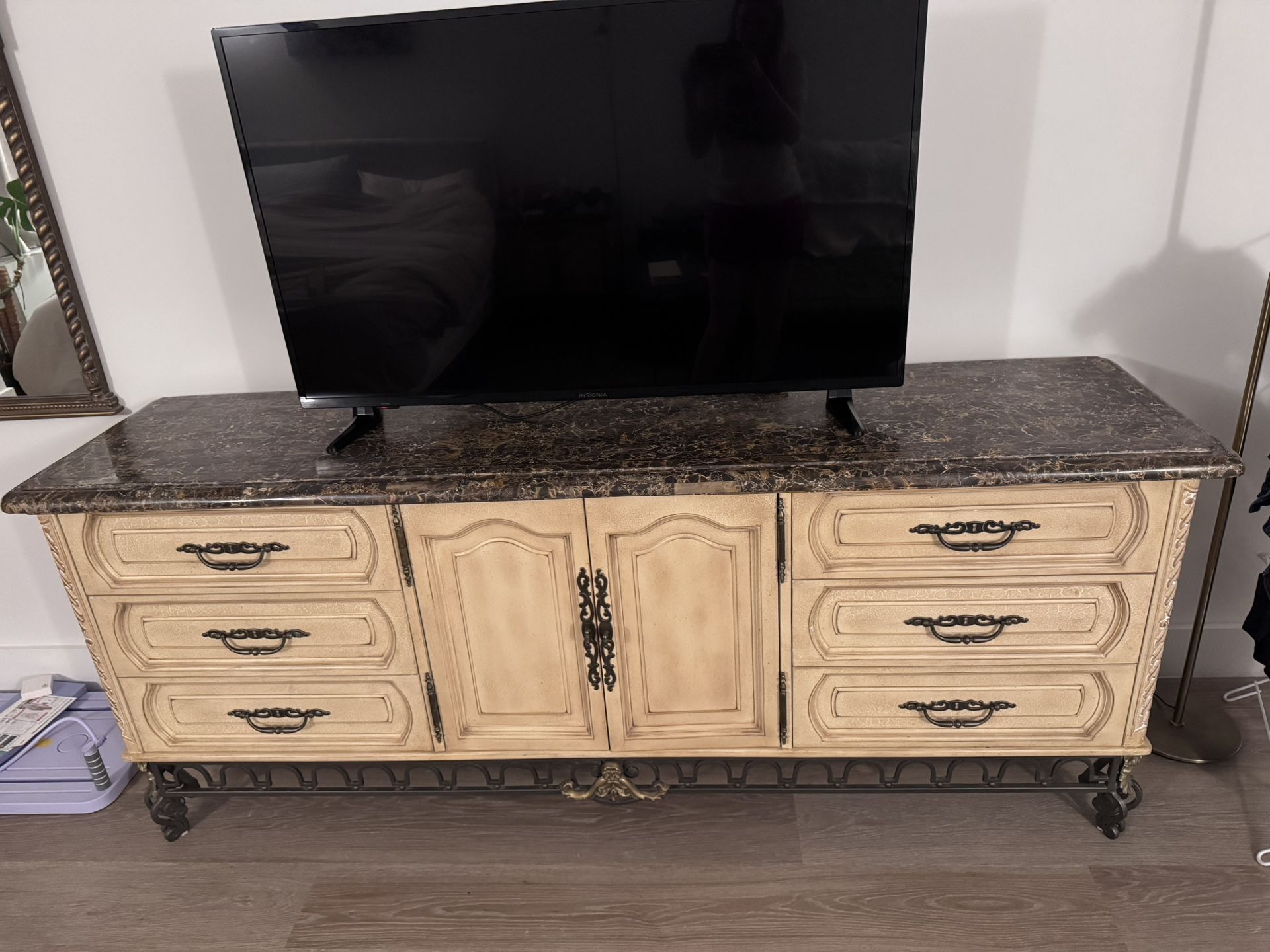 Gorgeous antique wood dresser with iron legs and real marble top. 9 drawers total - 6 large and 3 smaller. Good condition in clean smoke free apartment in elevator building Must come get by end of November. Open to best offer. Dimensions: 33.5” tall, 82” long, 20” wide
