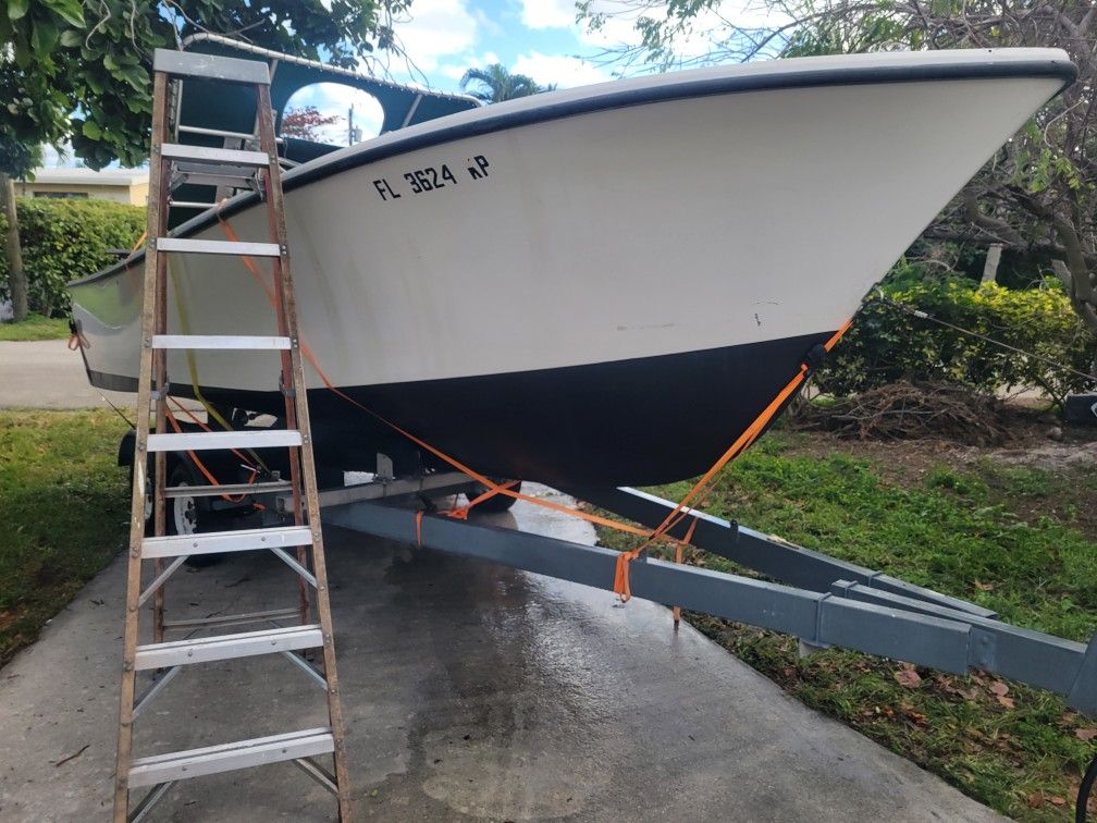 25ft Shamrock hull. Has shaft prop and rudder...no engine...has console* and T-top* great project boat With trailer Offers accepted
