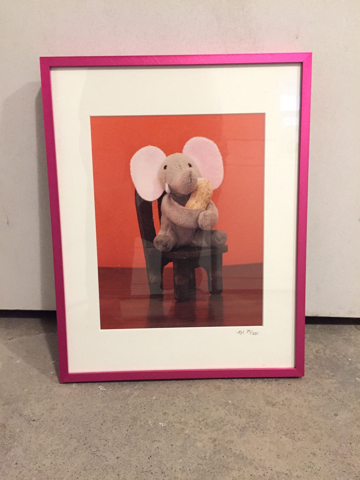 14-1/2” x 11-1/2” picture of an elephant holding a peanut. Perfect for a nursery.