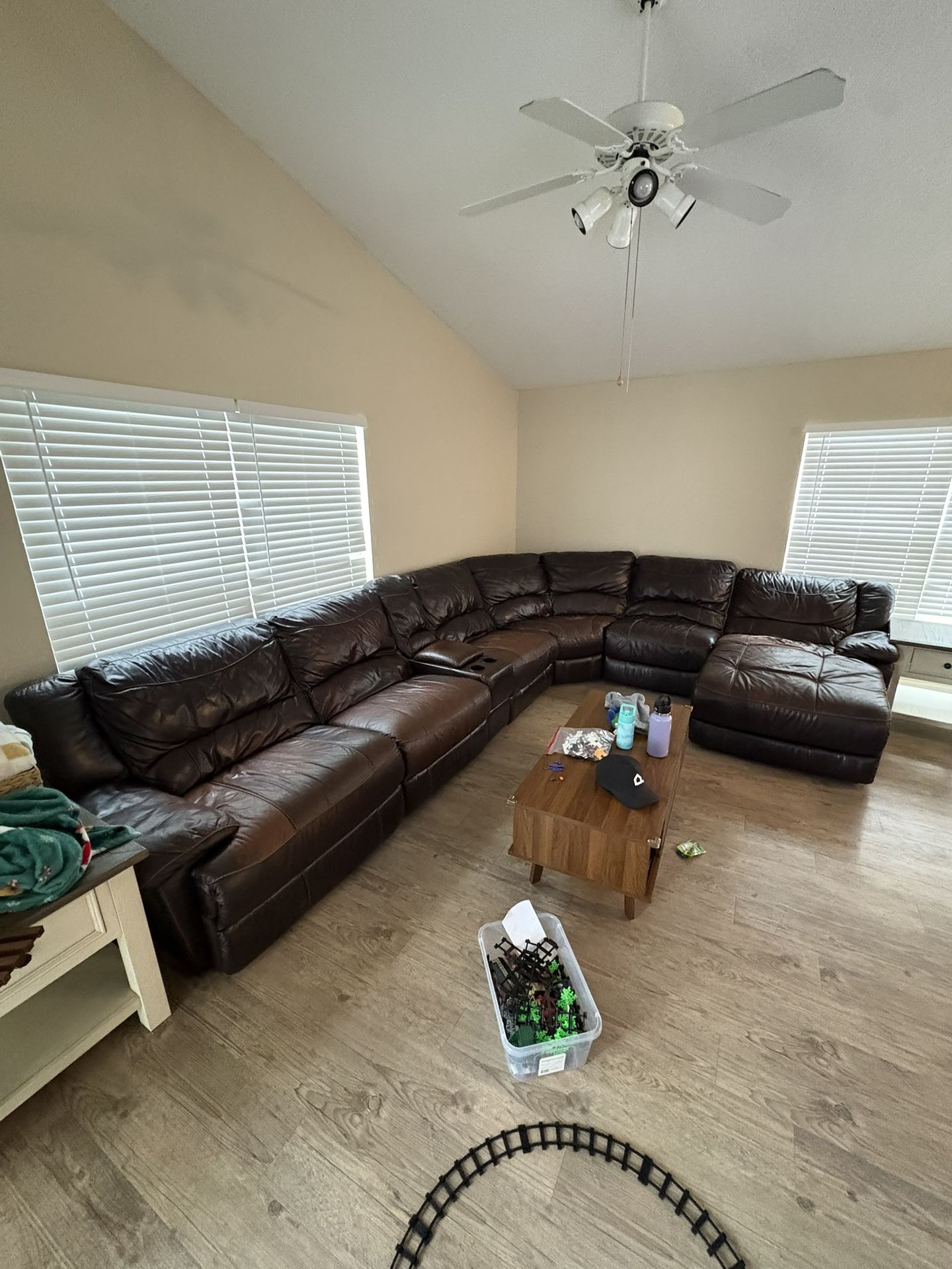 FREE! Sectional Brown leather couch. Love seat reclines, automatic recline needs new plug. Pick up only, can help load. Probably need large truck bed or trailer.