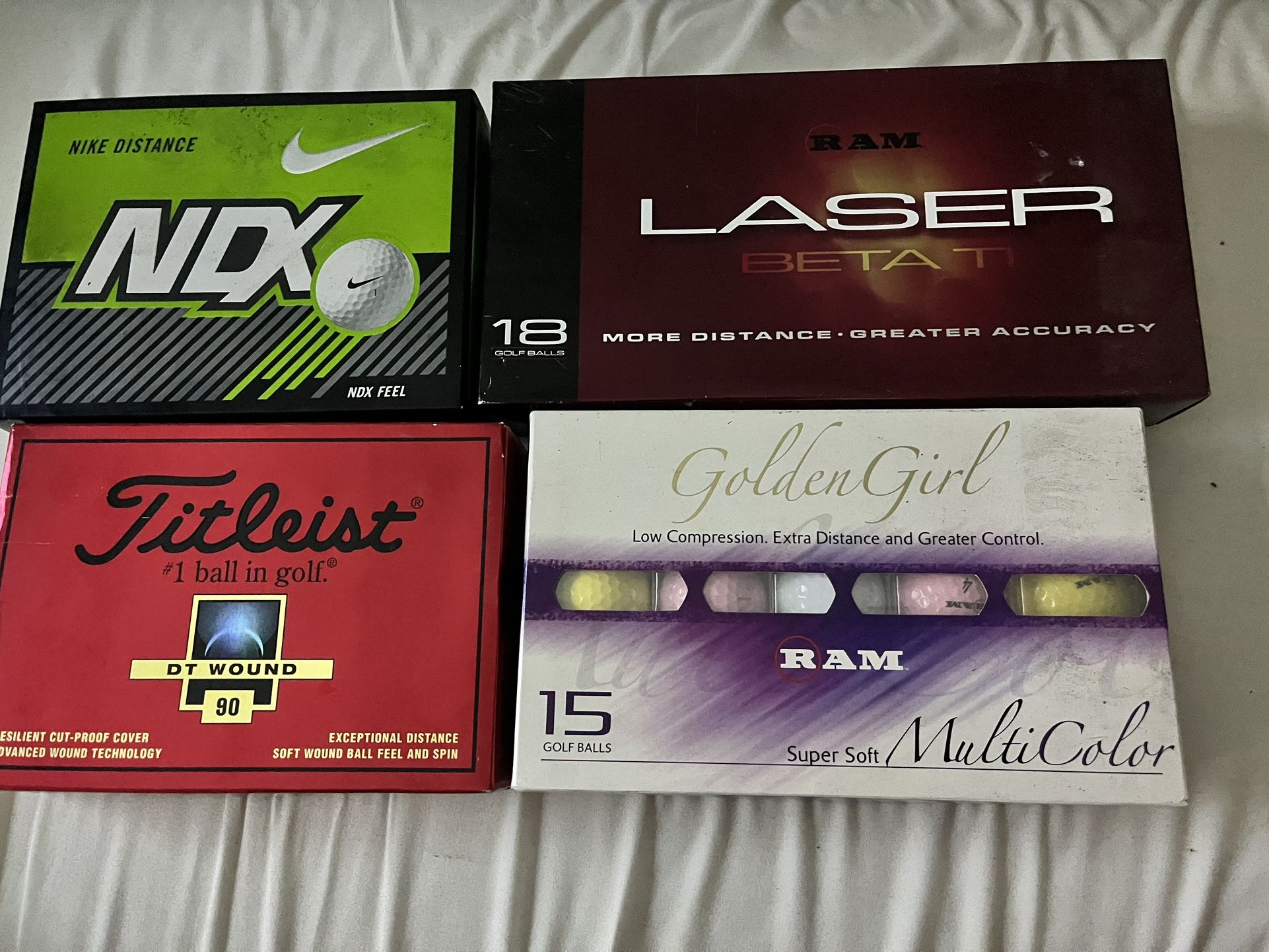 New golf balls. $35 for all 4 sets (57 balls in total) 12 Nike NDX 12 Titleist DT Wound 90 15 RAM - Golden Girl (MultiColor) 18 RAM - Laser BETA TI All four sets are new and only $35 for all of them!! Great Christmas gift idea!! Individual box prices; 12 Nike NDX $10 12 Titleist DT Wound 90 $15 15 RAM Golden Girl $10 18 RAM Laser Beta TI $10